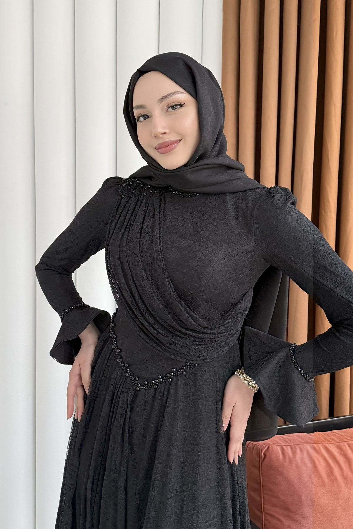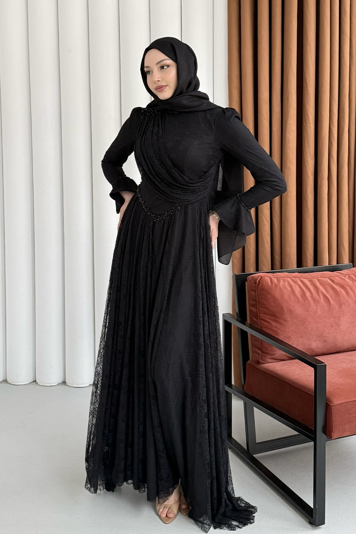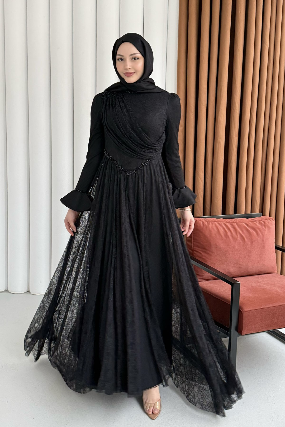 Premium Taş İşlemeli Dökümlü Yaka Tesettür Abiye-SİYAH (5230)