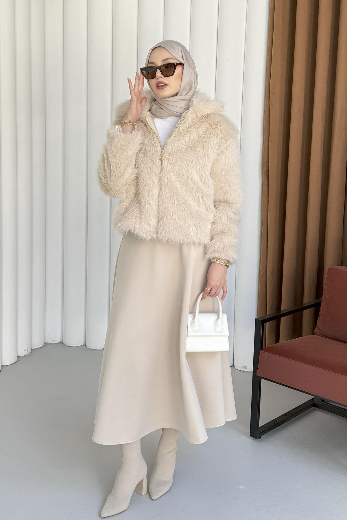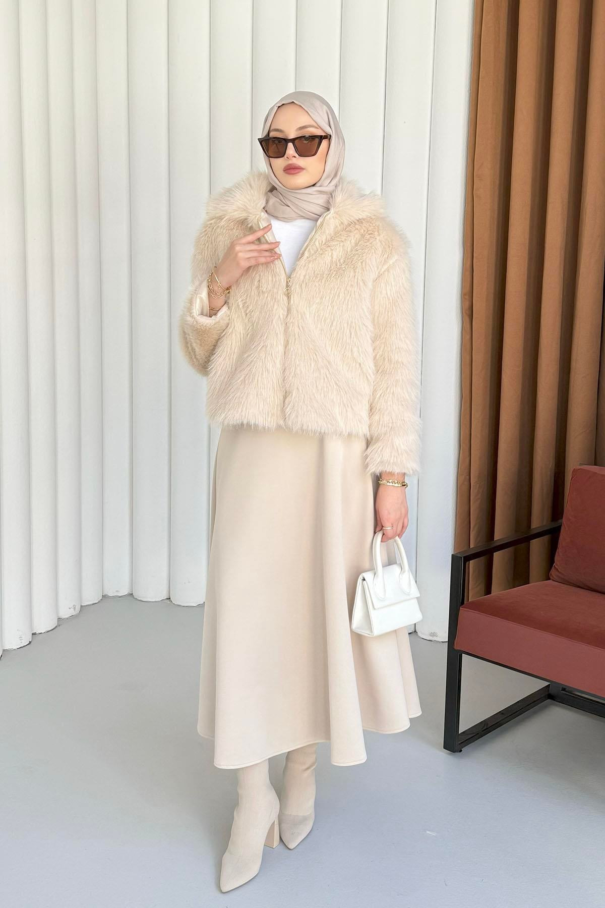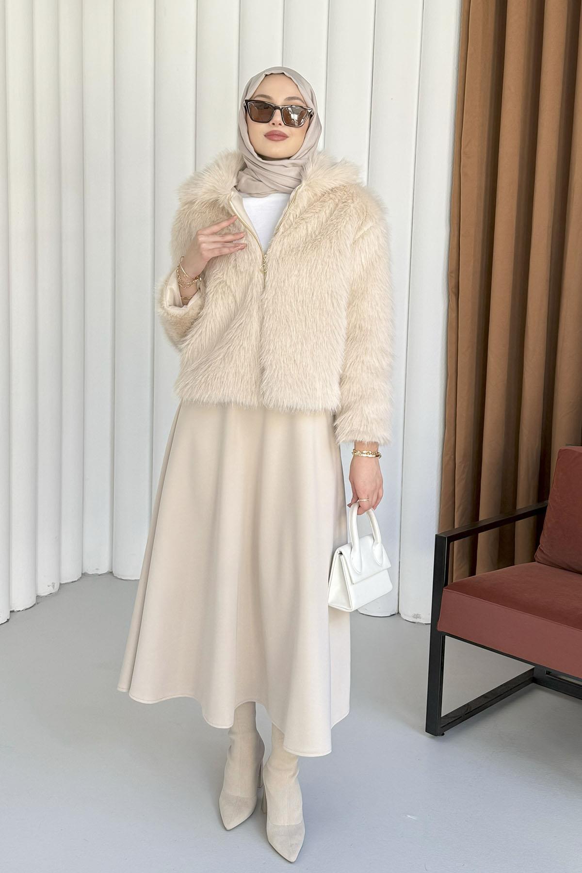 Premium Yakalı Kısa Kürk Mont-BEJ (1132)