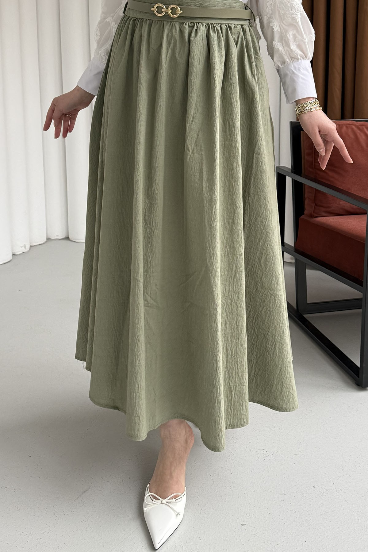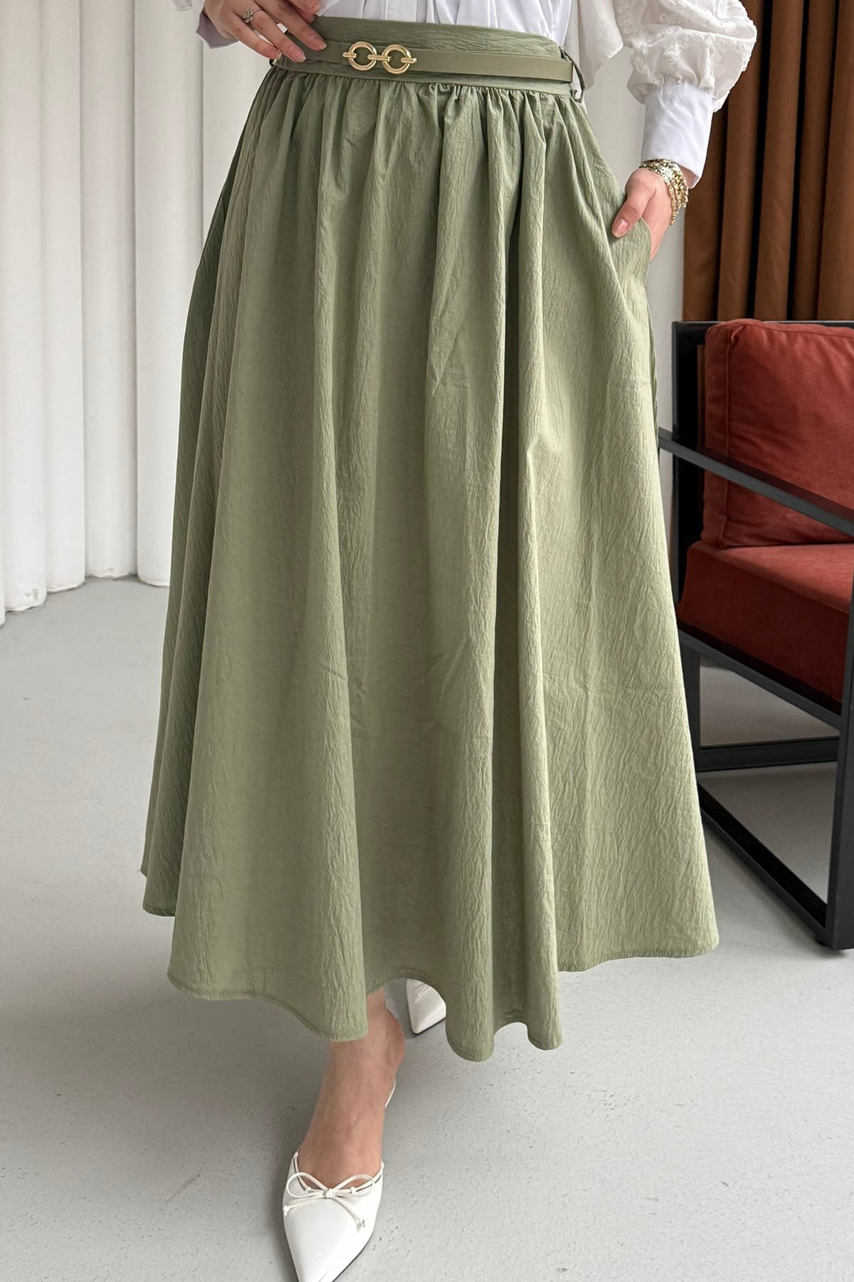 Rahat Kalıp Cepli Kemer Detaylı Lastikli Bel Etek-ÇAĞLA YEŞİLİ (9065)