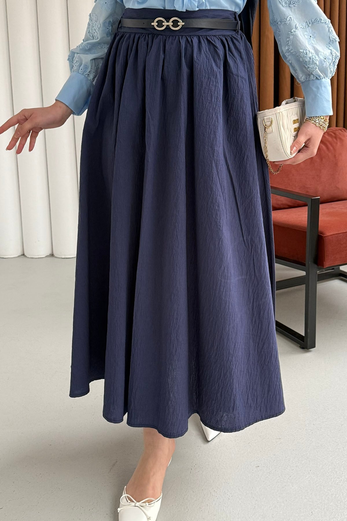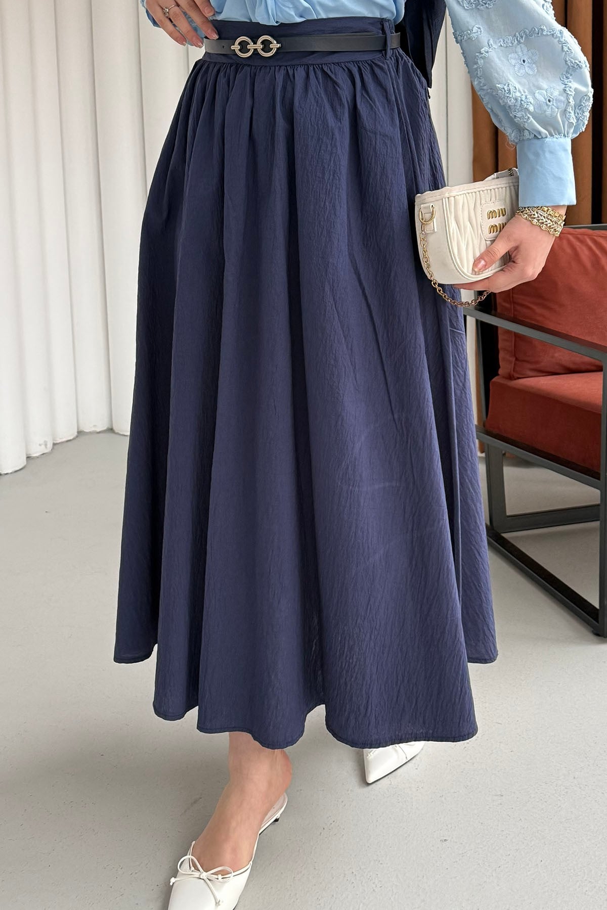 Rahat Kalıp Cepli Kemer Detaylı Lastikli Bel Etek-LACİVERT (9065)