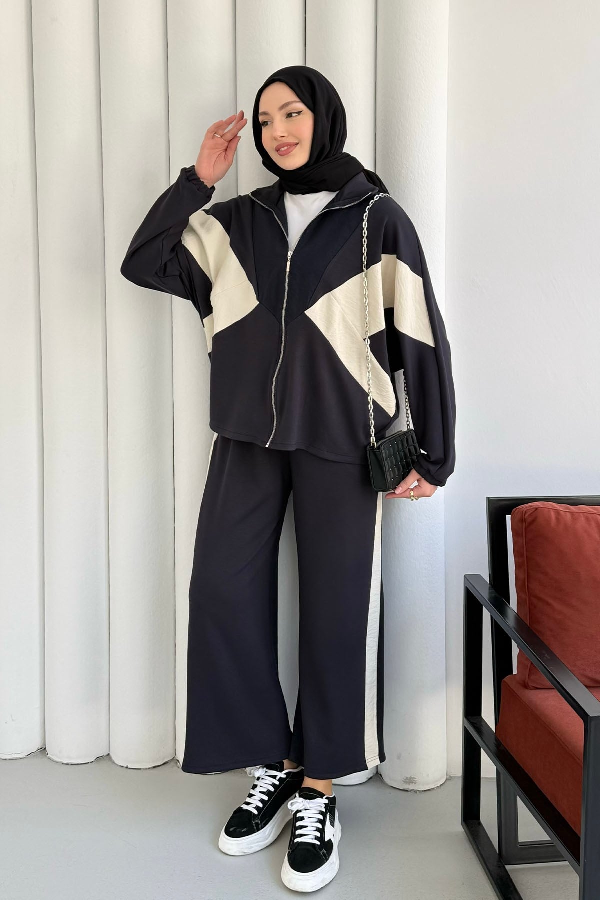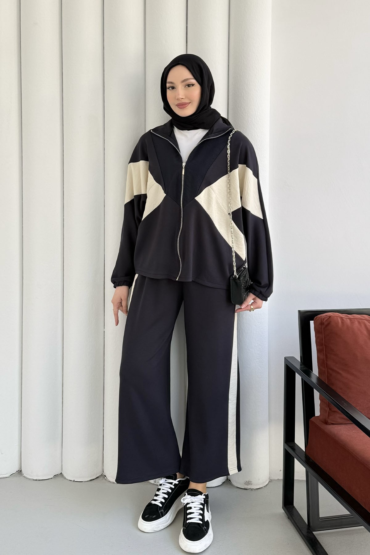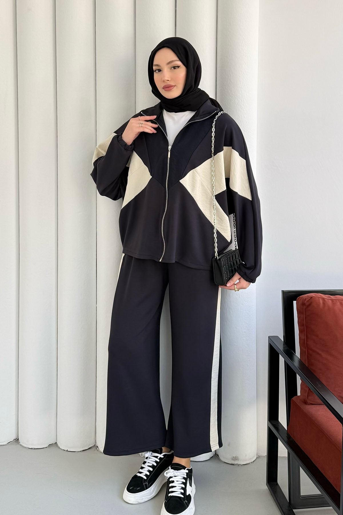 Renkli Paraşüt Detay Pantolonlu Tesettür Takım-ANTRASİT (22836)