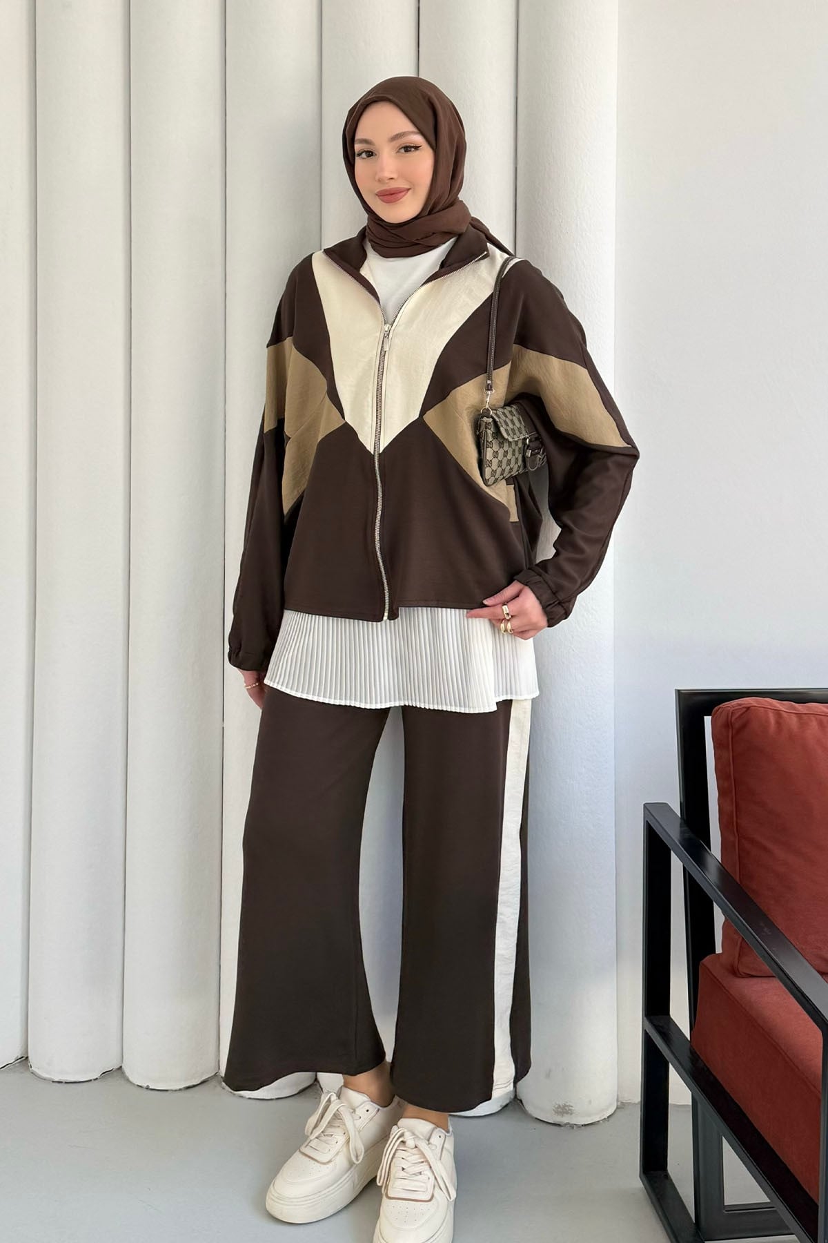 Renkli Paraşüt Detay Pantolonlu Tesettür Takım-KAHVERENGİ (22836)