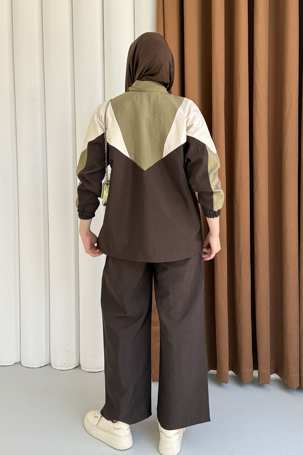 Renkli Paraşüt Detay Pantolonlu Tesettür Takım-KAHVERENGİ (3136)