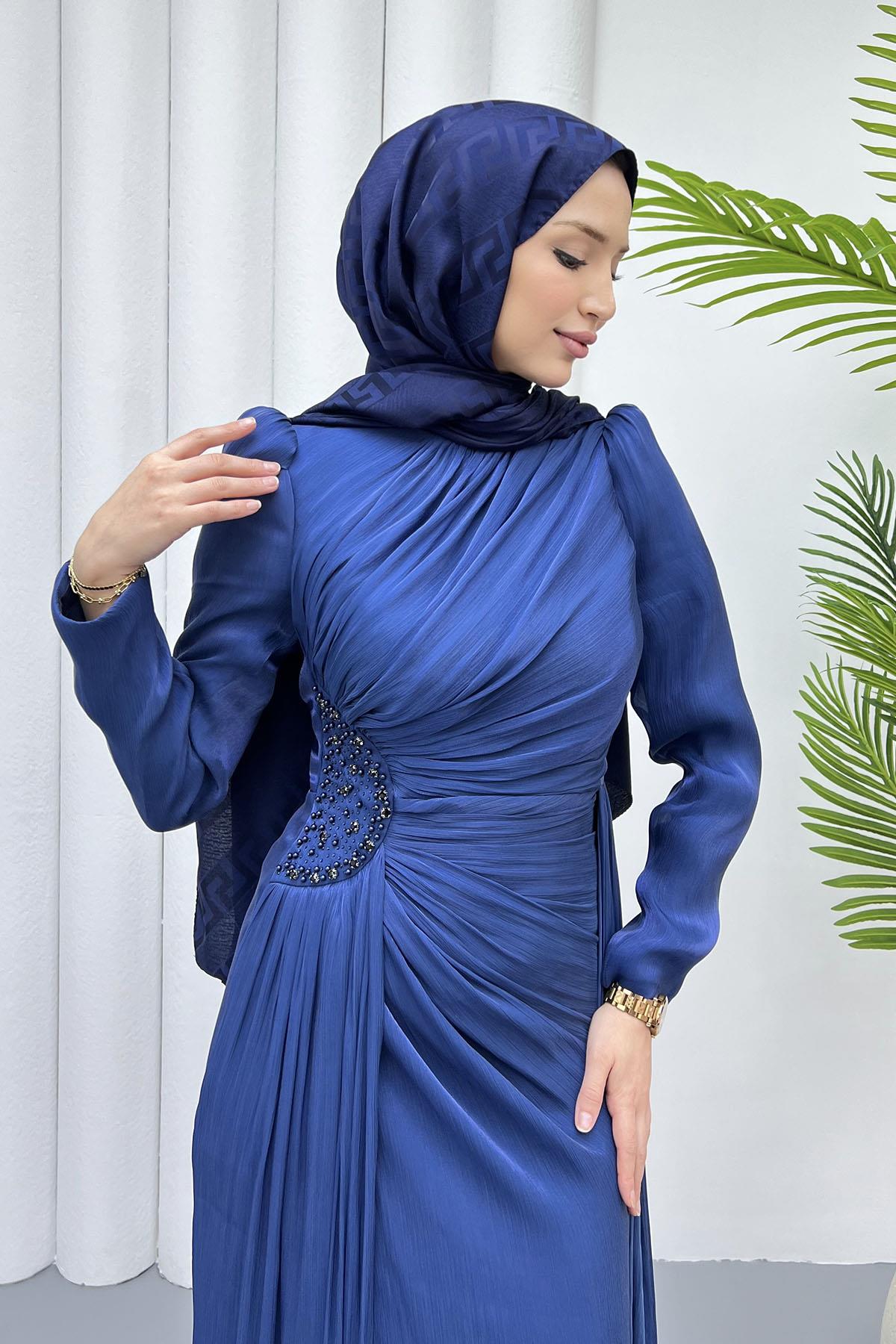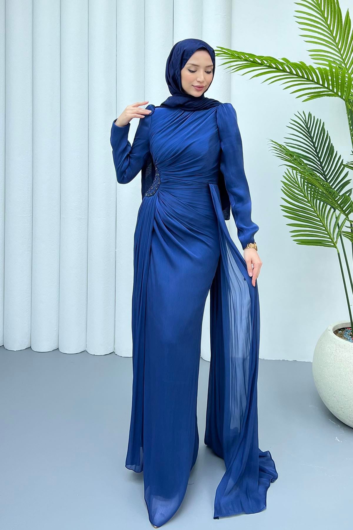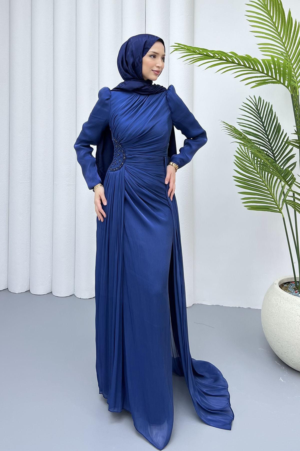Sağ Taraf Taş İşlemeli Kuyruklu Tesettür Abiye-İNDİGO (5148)