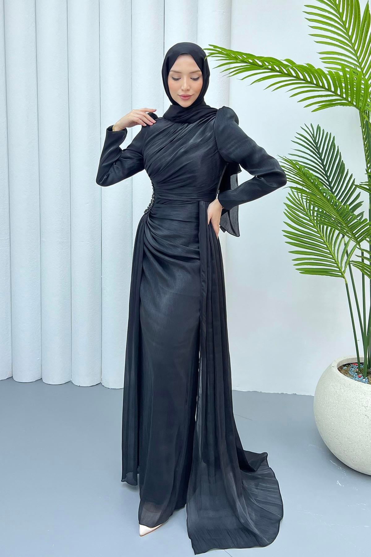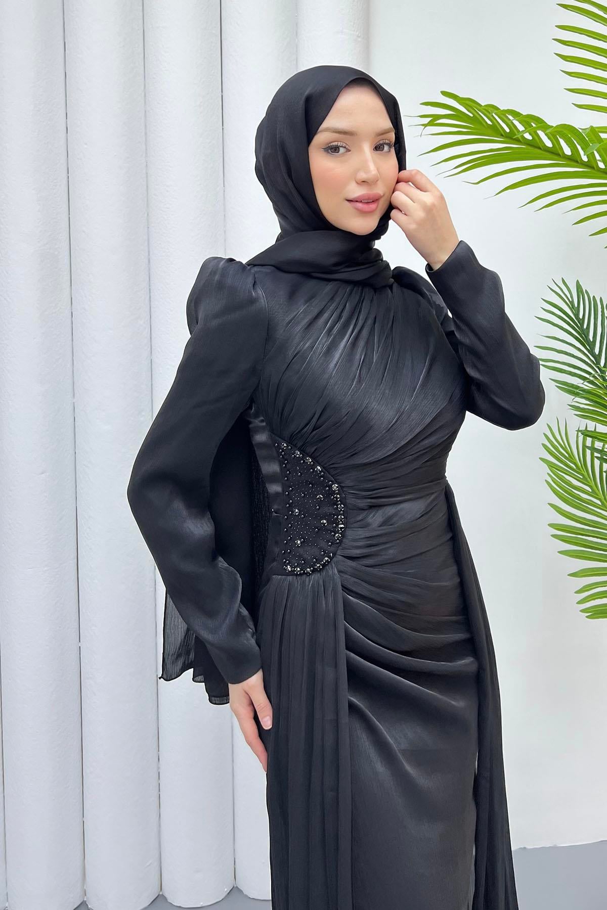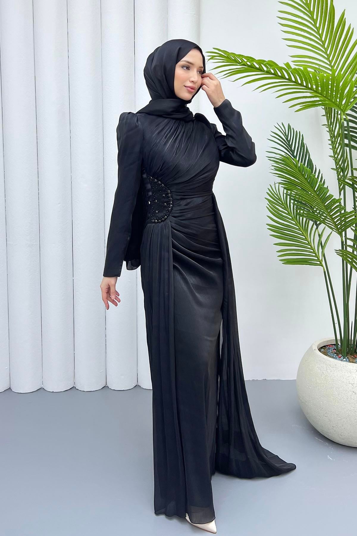 Sağ Taraf Taş İşlemeli Kuyruklu Tesettür Abiye-SİYAH (5148)