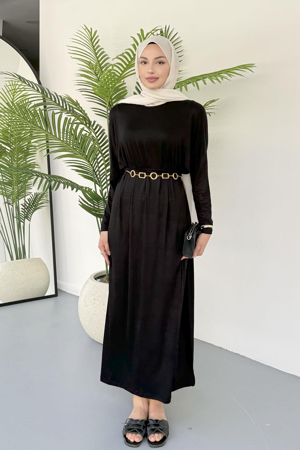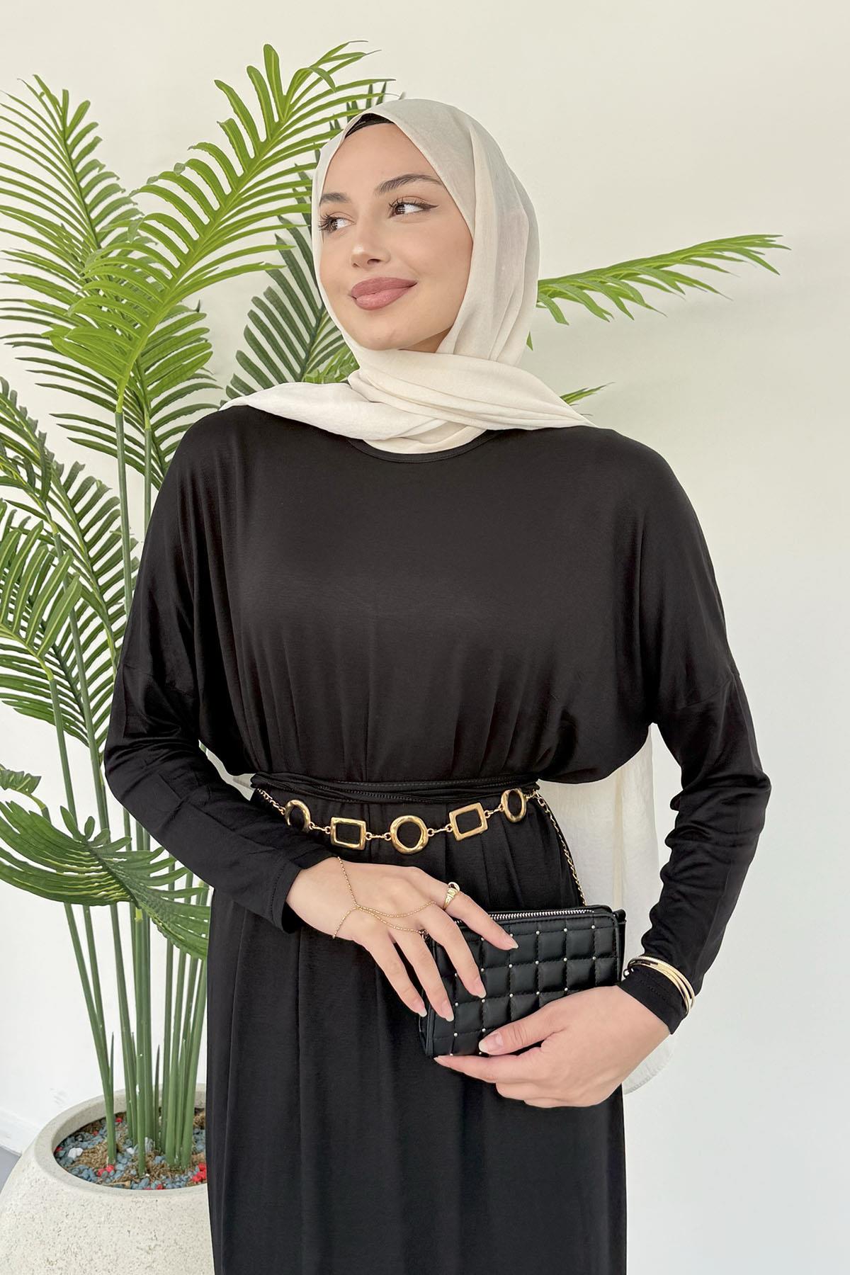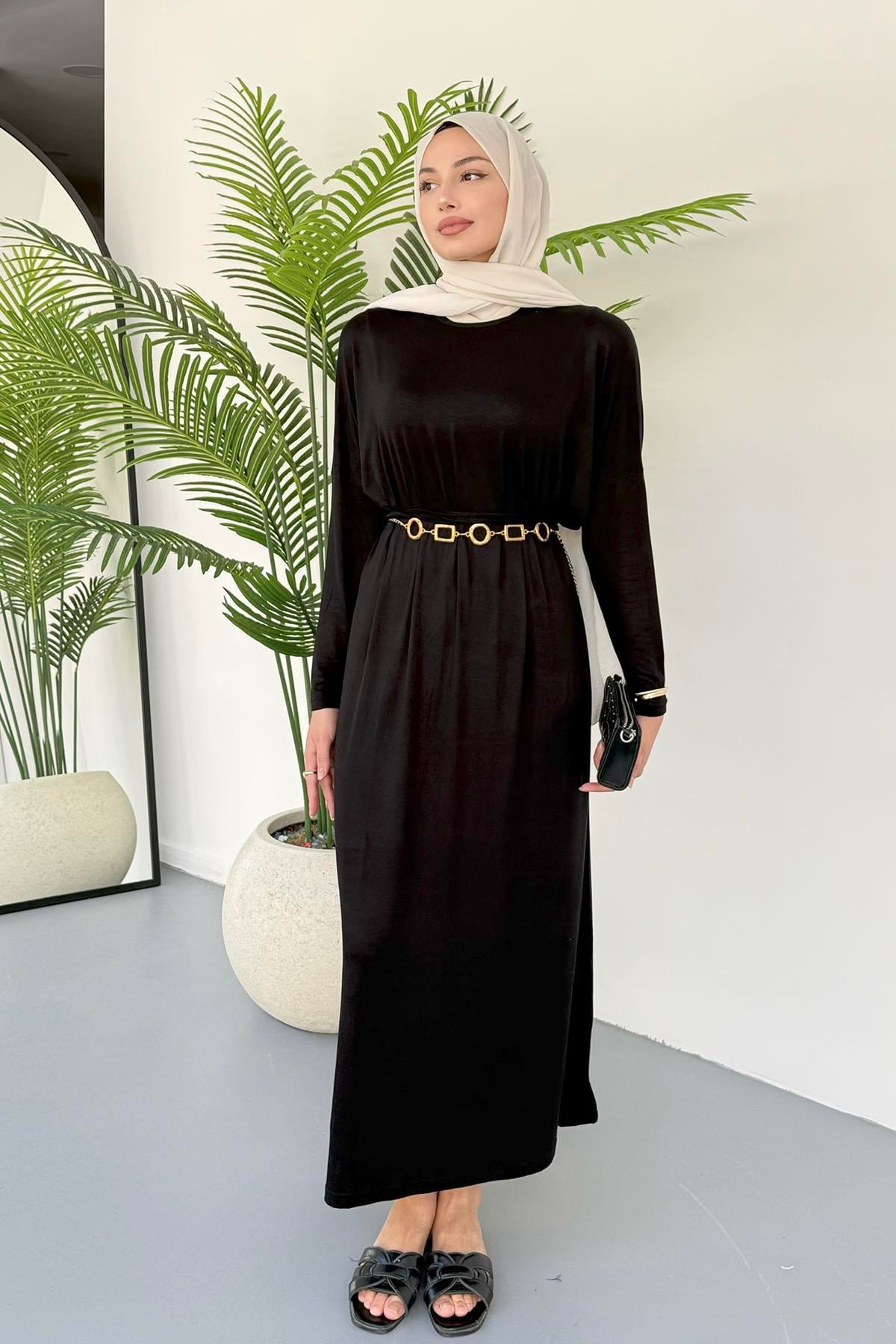 Sandy Kumaş Tesettür Elbise-SİYAH (24330)