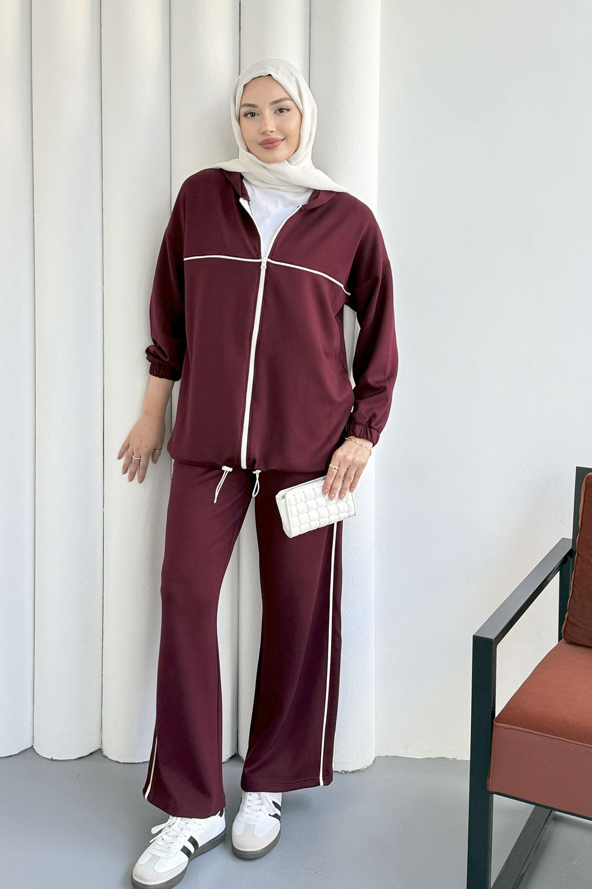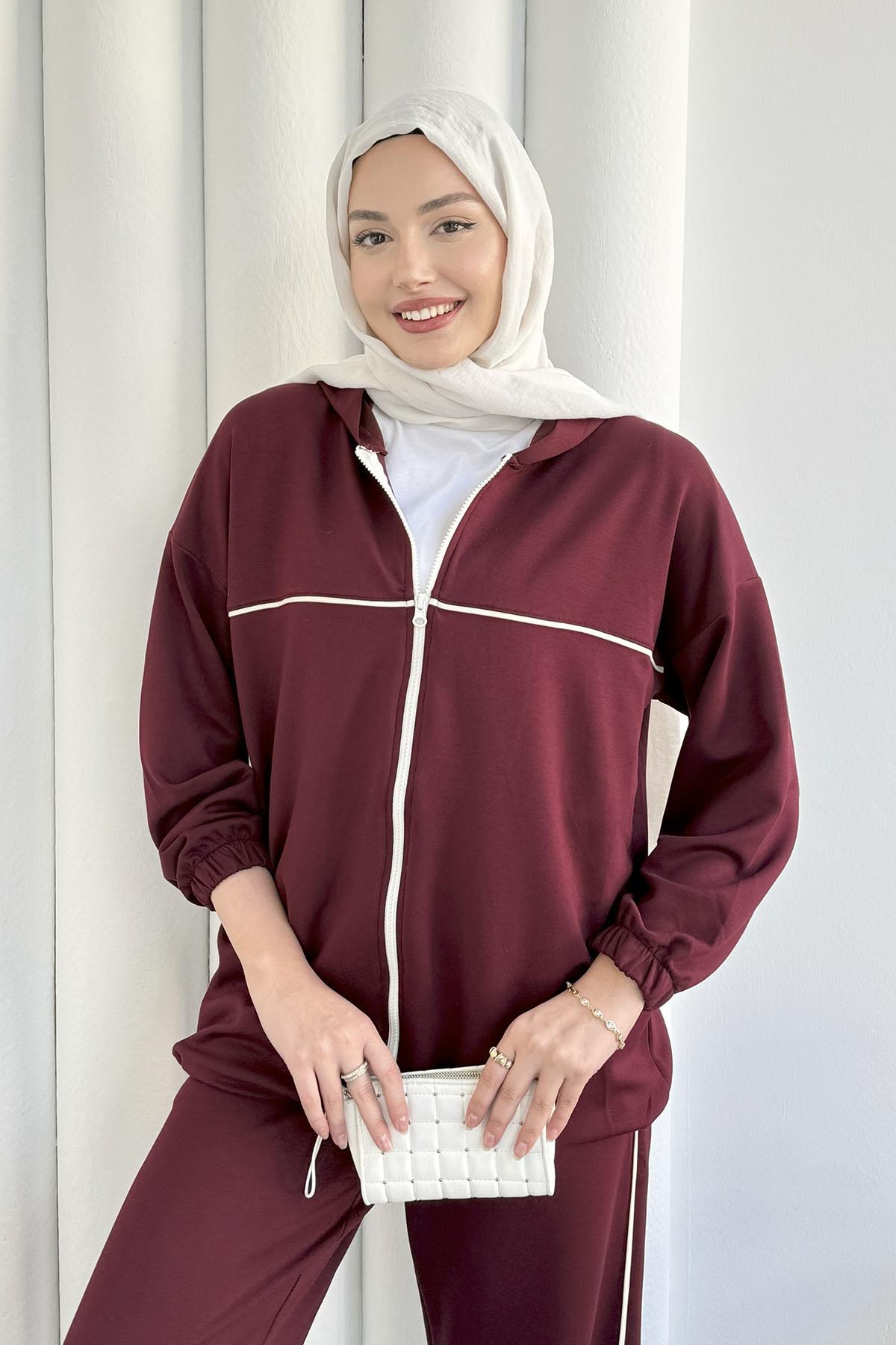Şerit Detaylı Kapüşonlu Tesettür Takım-BORDO (3011)