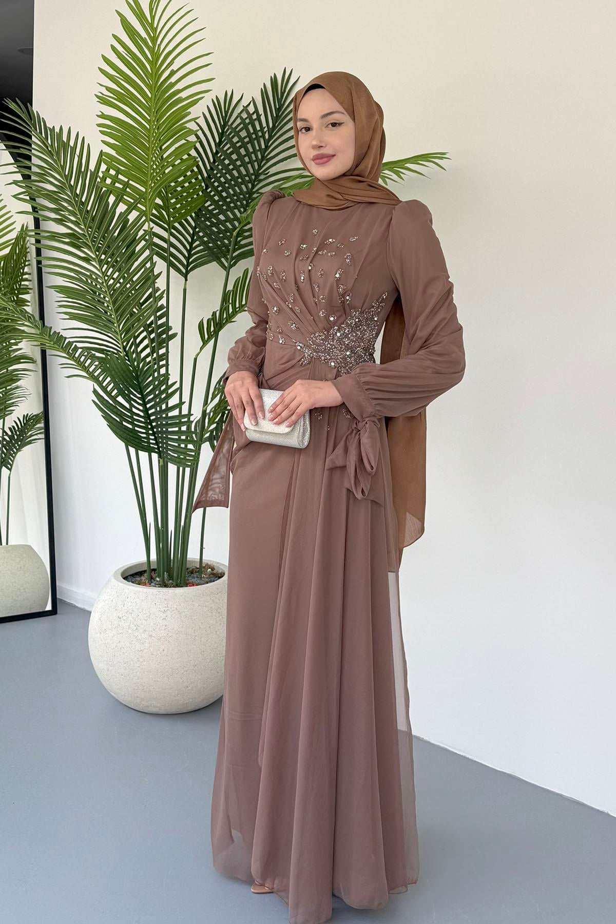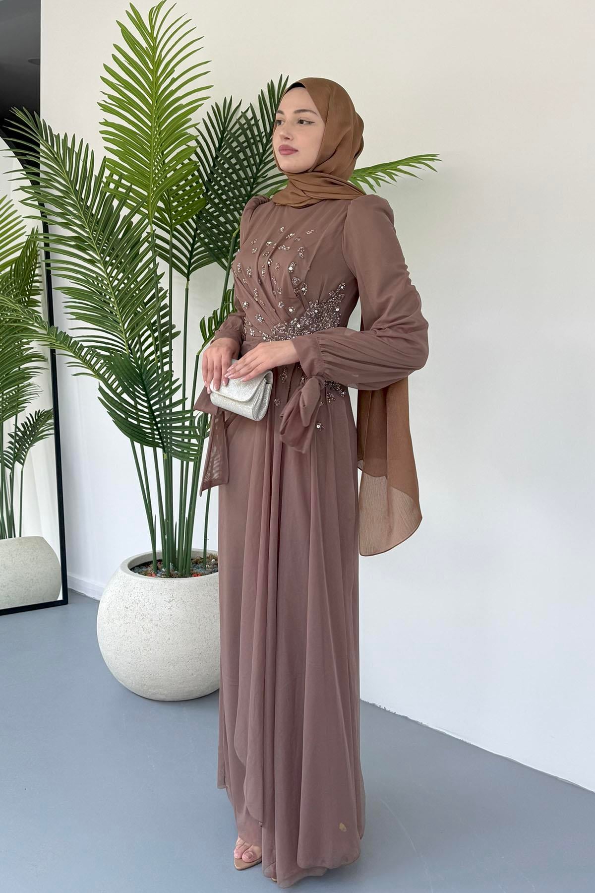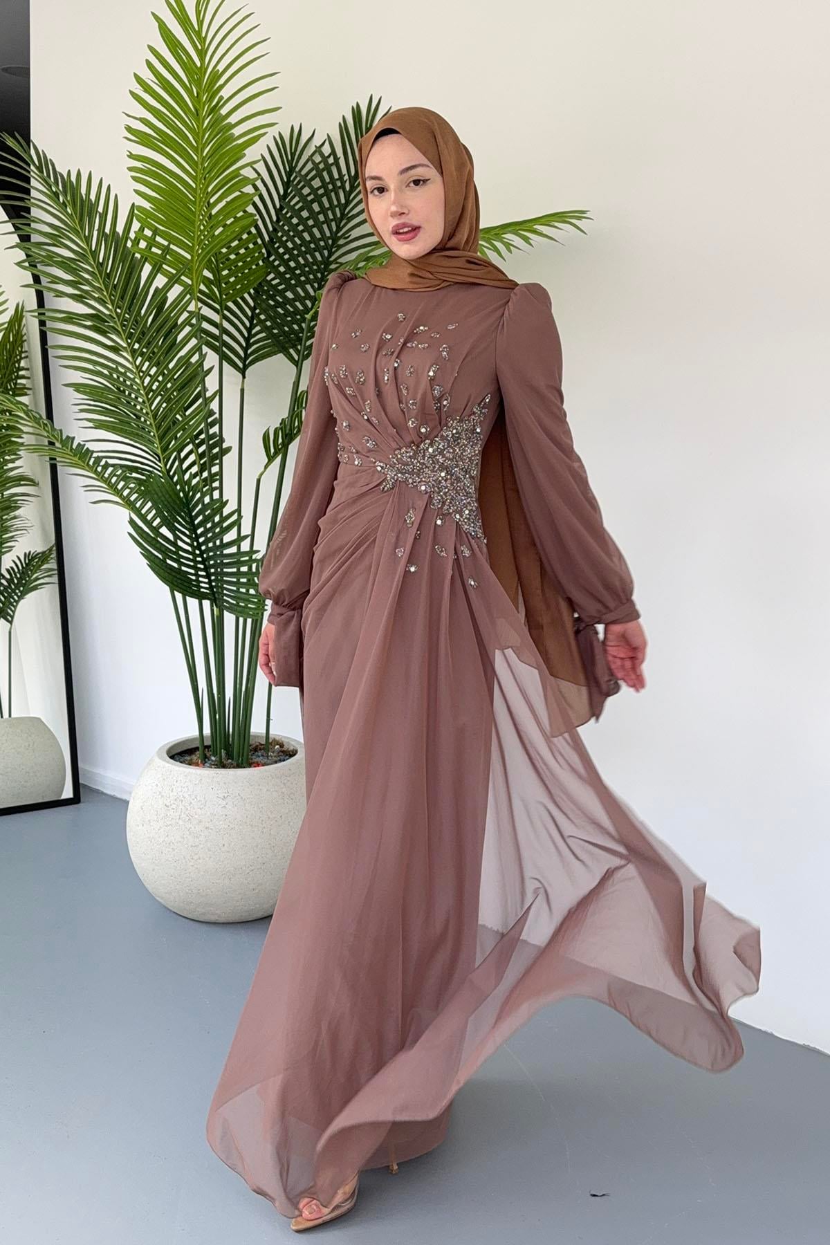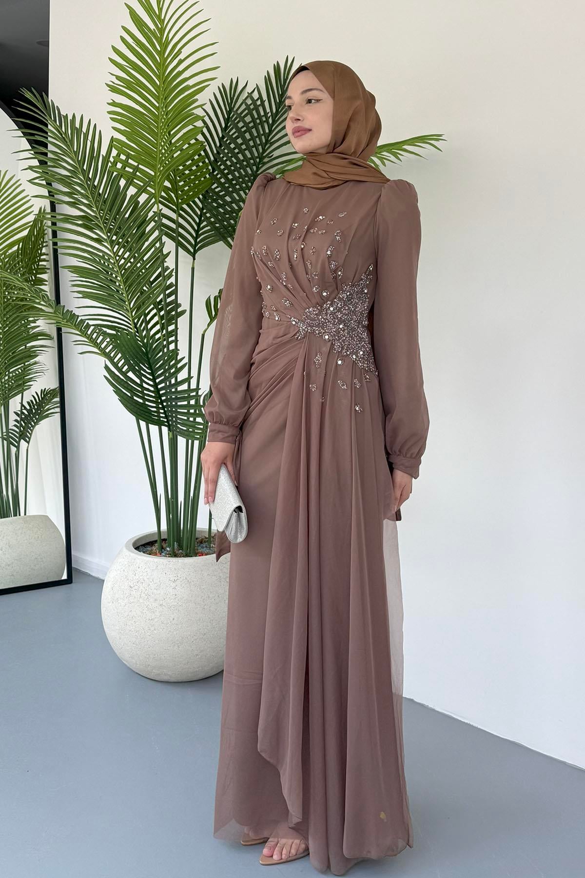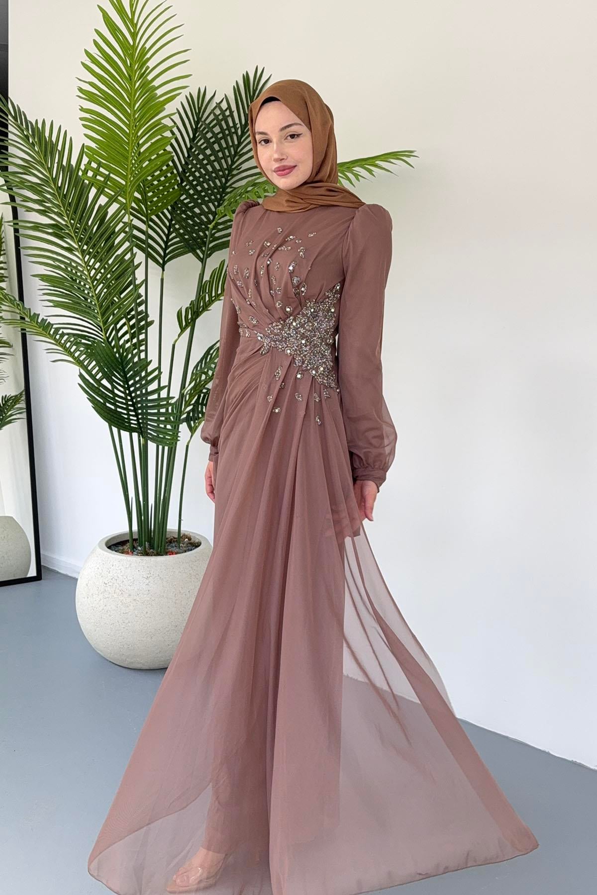 Taş Işıltılı Yandan Drapeli Tesettür Tül Abiye-KAHVERENGİ (5349)