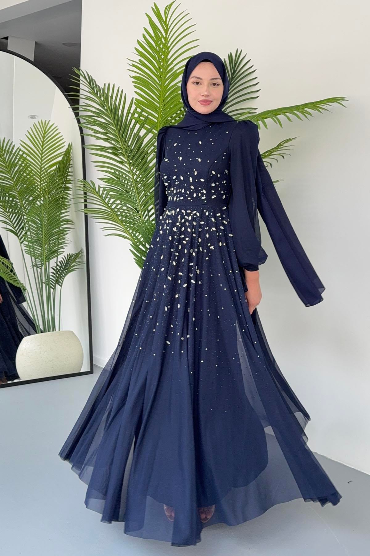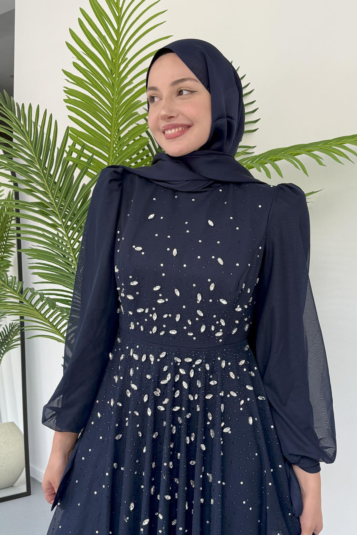 Taş İşlemeli Duru Tesettür Abiye-LACİVERT (5283)