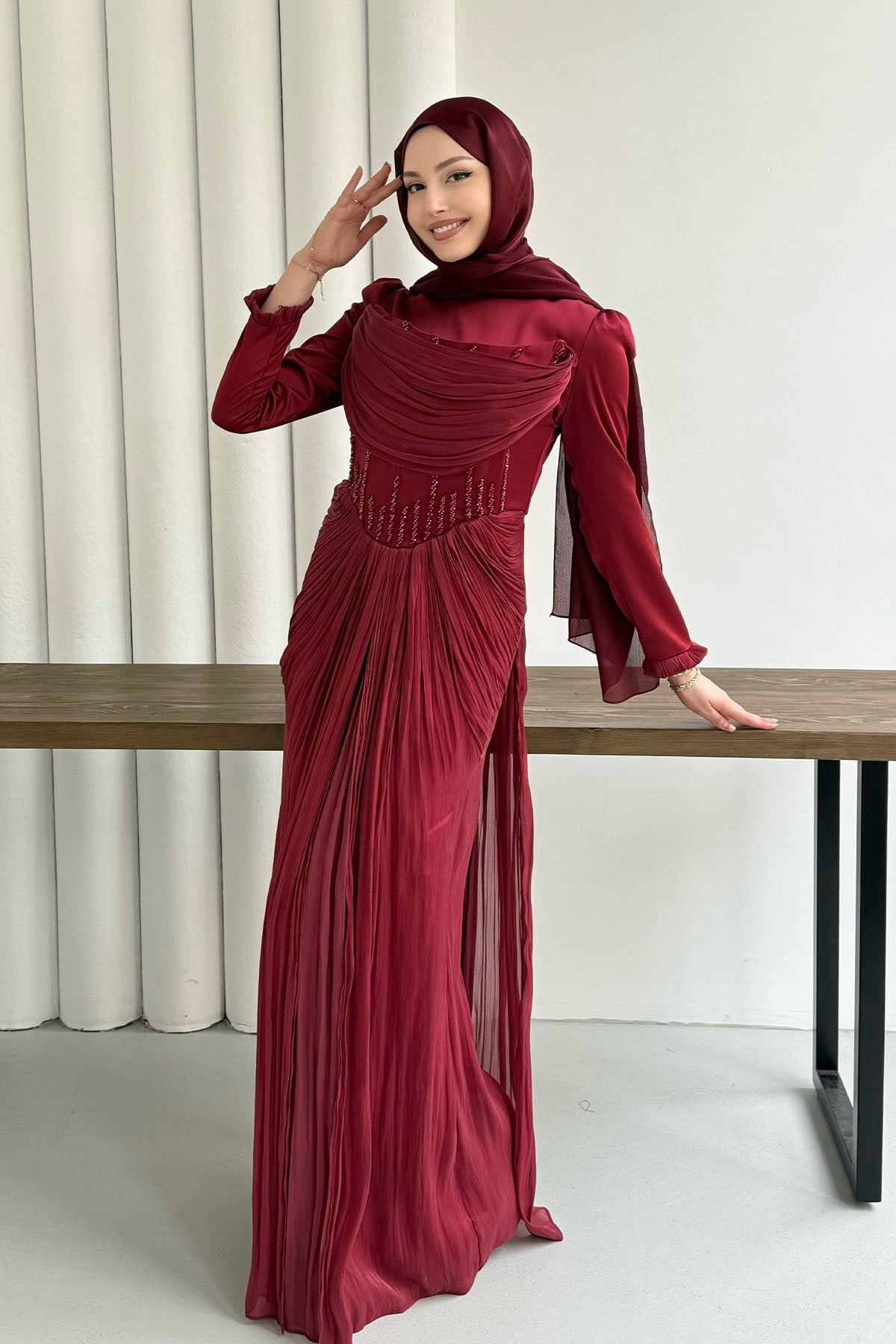 Taş İşlemeli Korse Detaylı Tesettür Abiye-BORDO (149)
