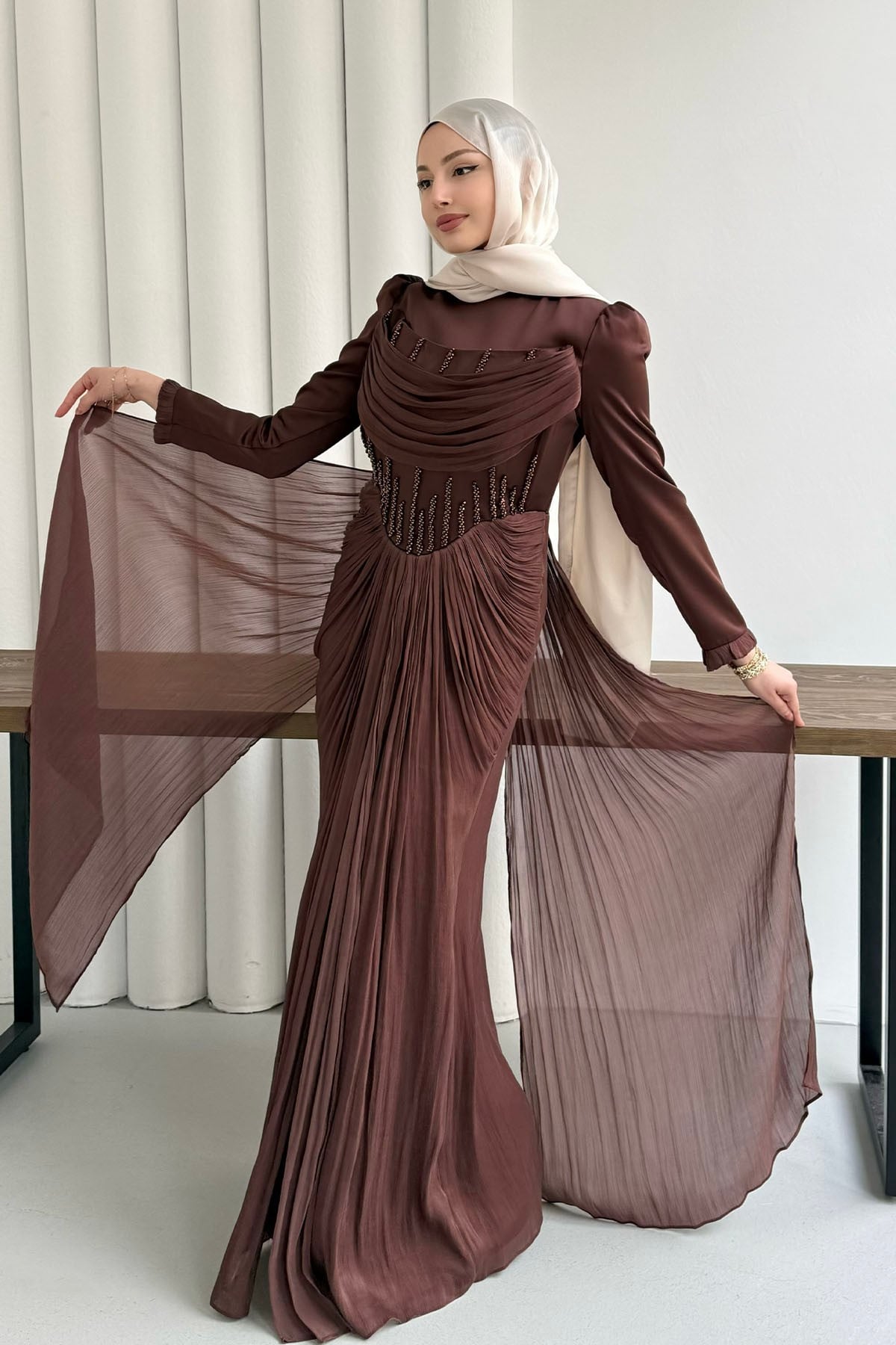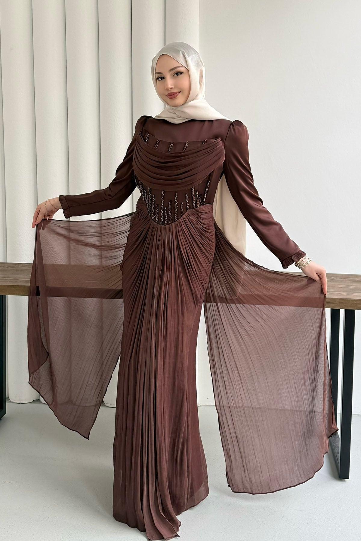 Taş İşlemeli Korse Detaylı Tesettür Abiye-KAHVERENGİ (149)