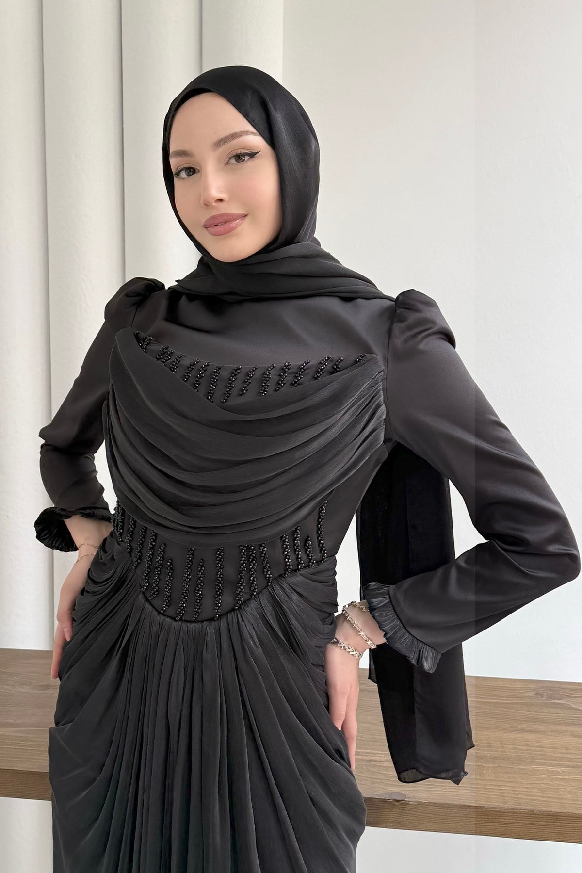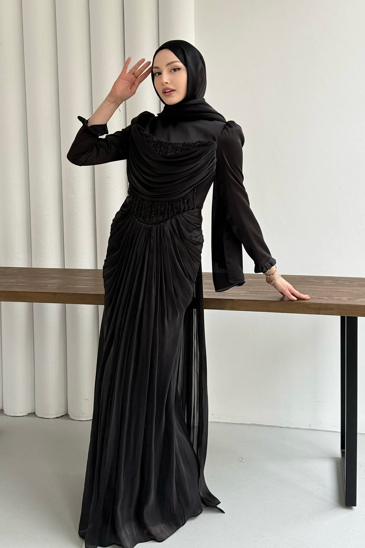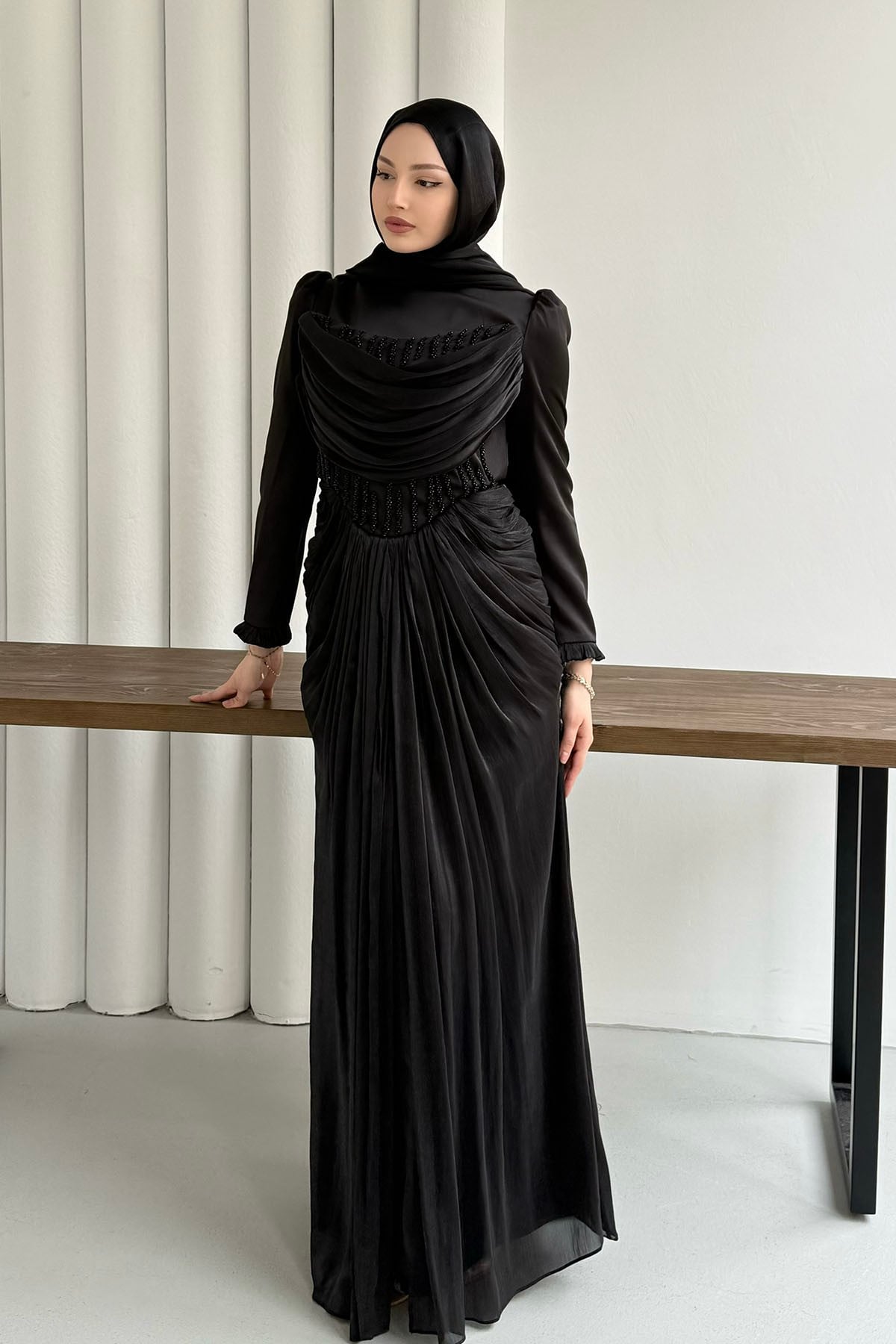 Taş İşlemeli Korse Detaylı Tesettür Abiye-SİYAH (149)