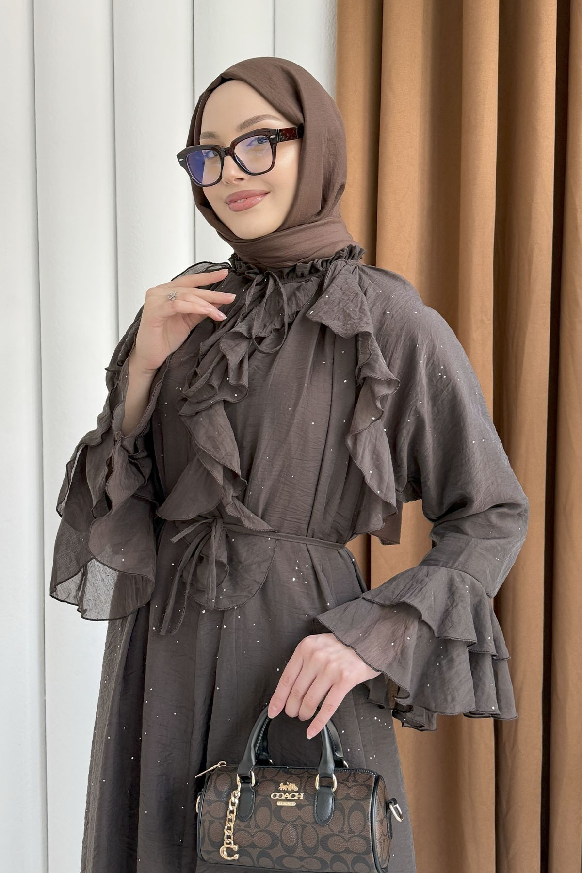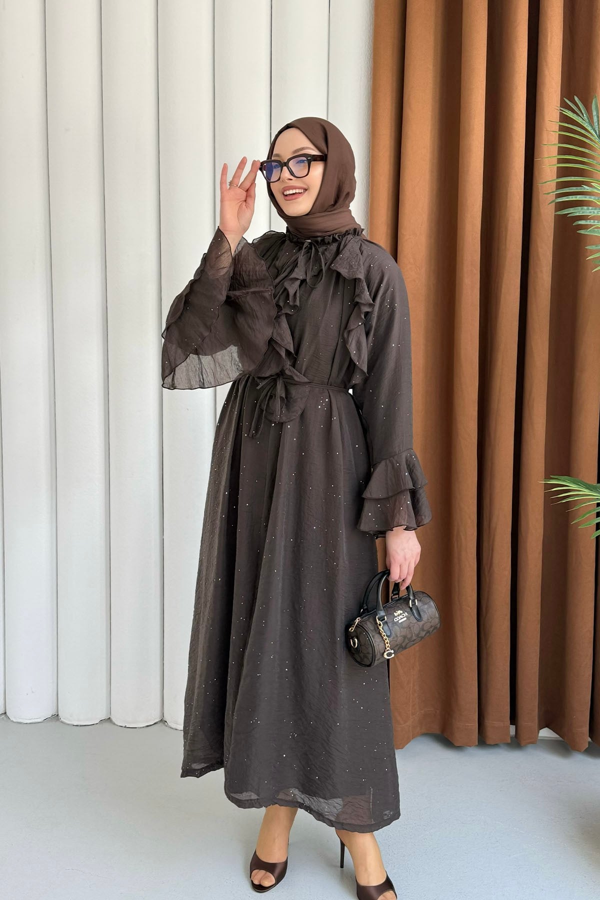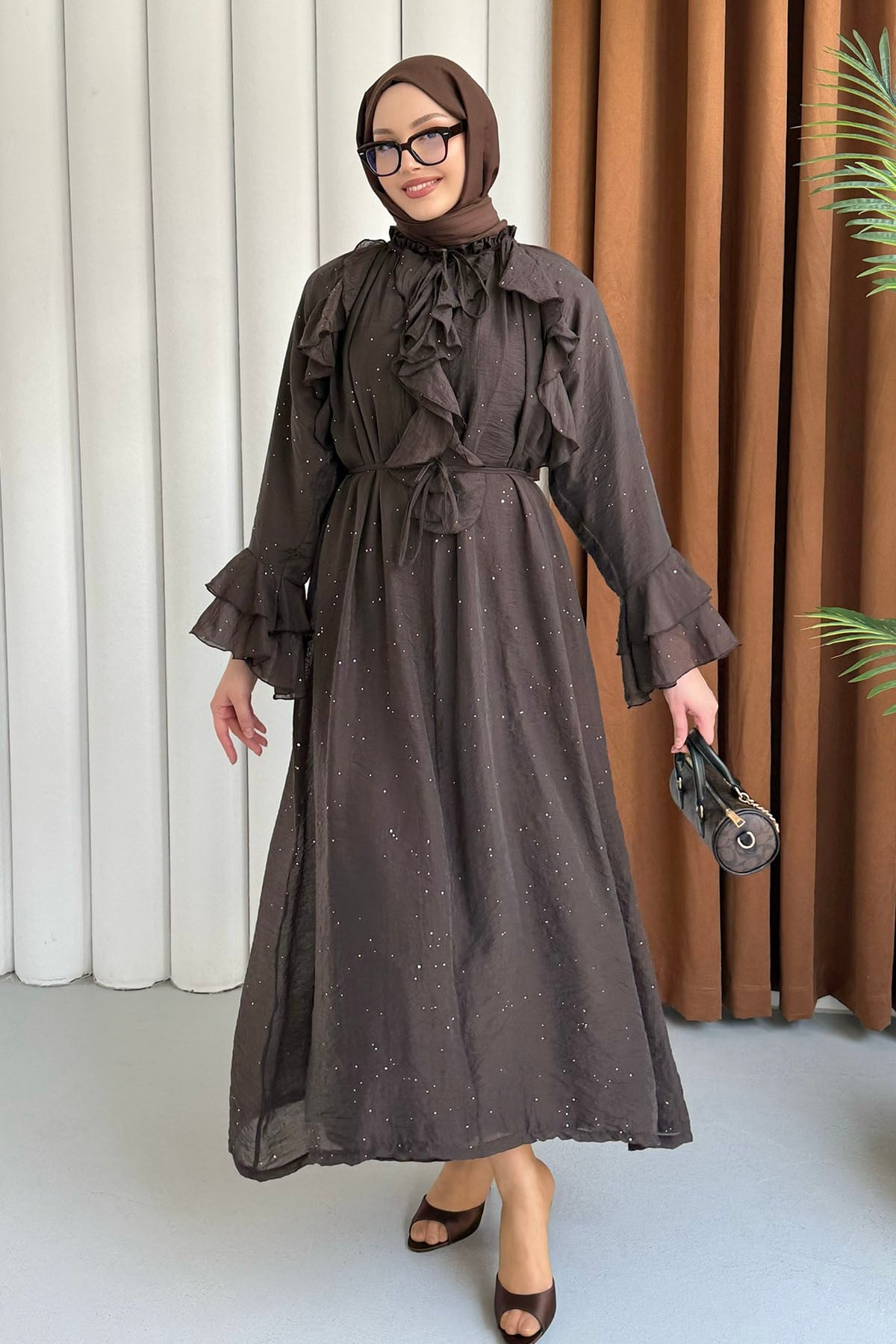 Taş Süslemeli Belden Bağlamalı Volanlı Tesettür Elbise-KAHVERENGİ (25131)