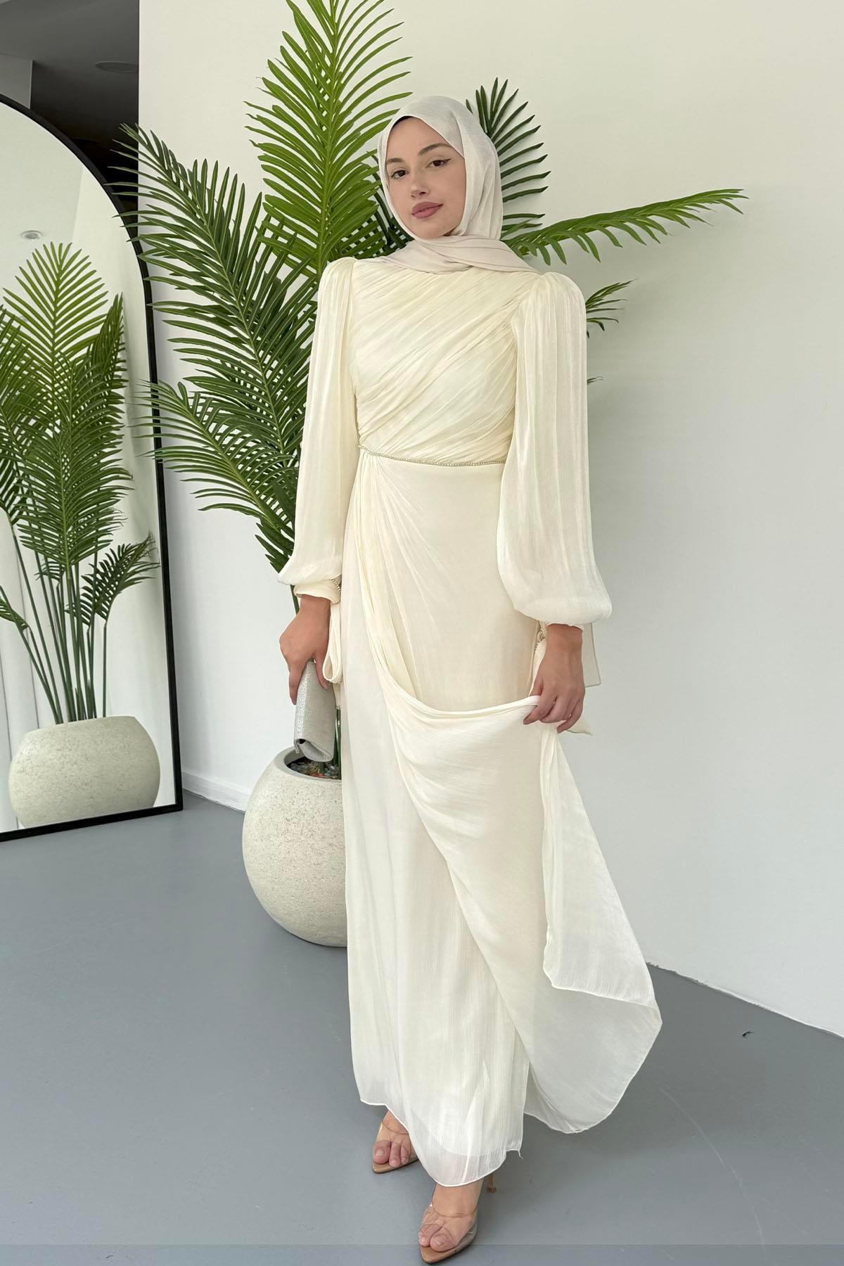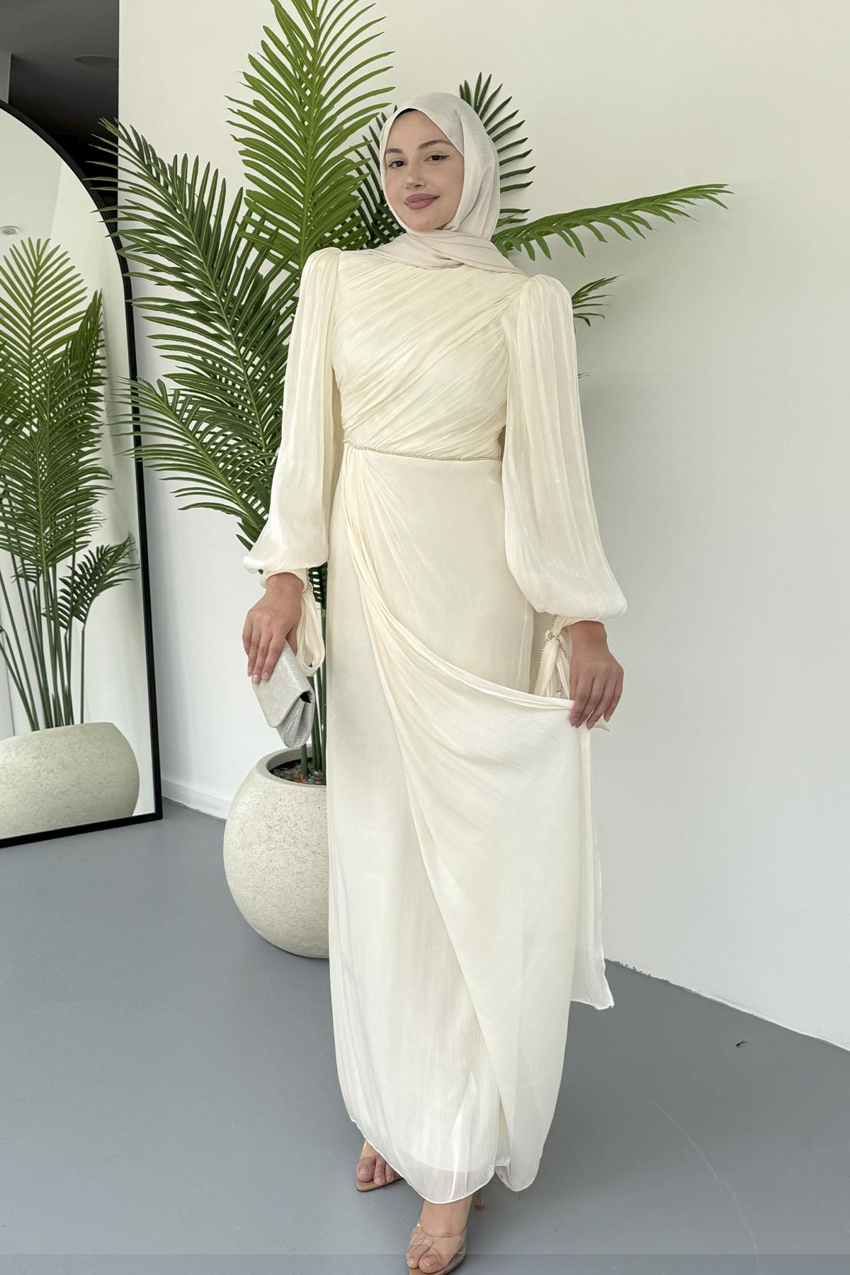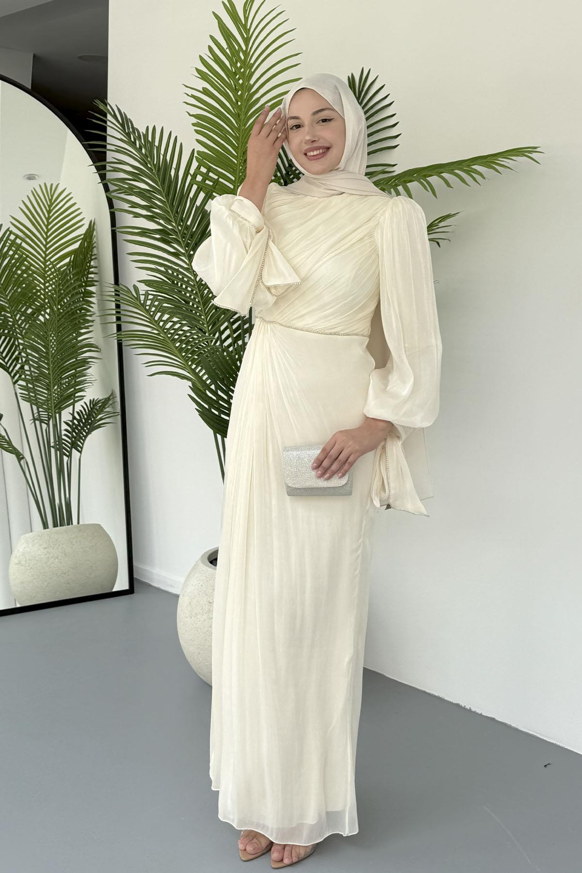 Taşla Süslenmiş Zarif Tesettür Abiye-EKRU (5019)
