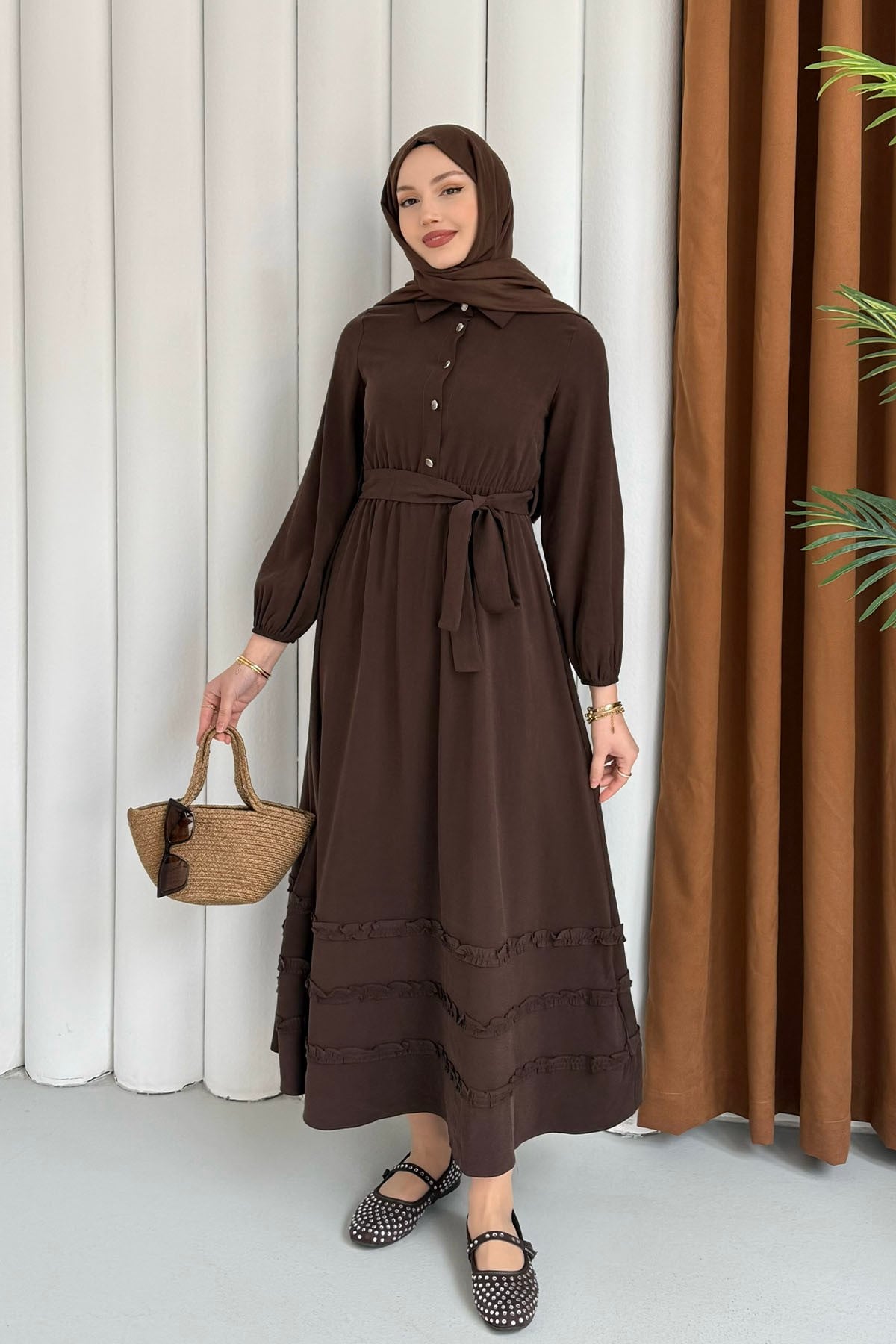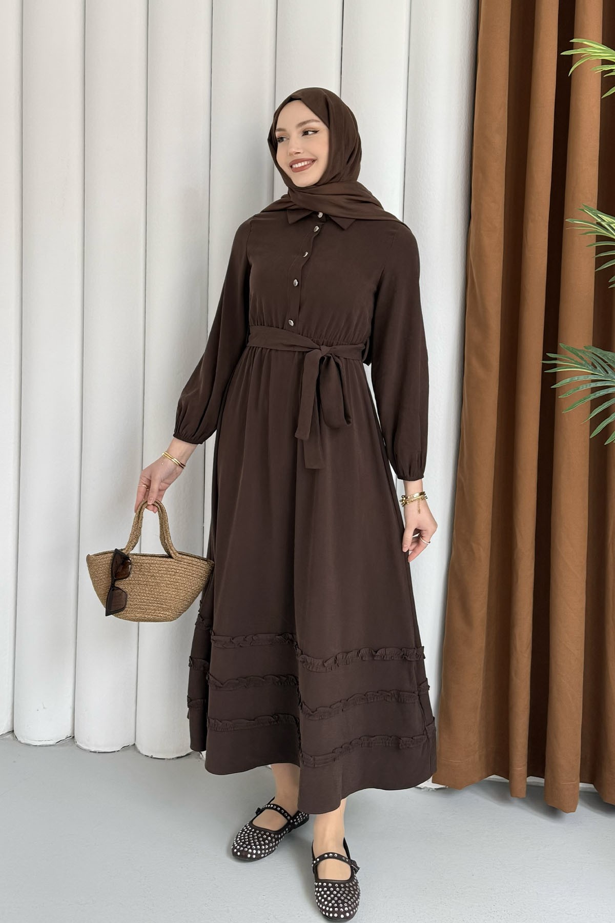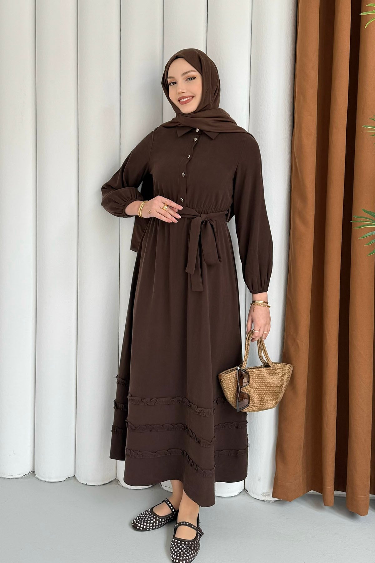 Twis Yarım Düğmeli Zarif Tesettür Elbise-KAHVERENGİ (5985)