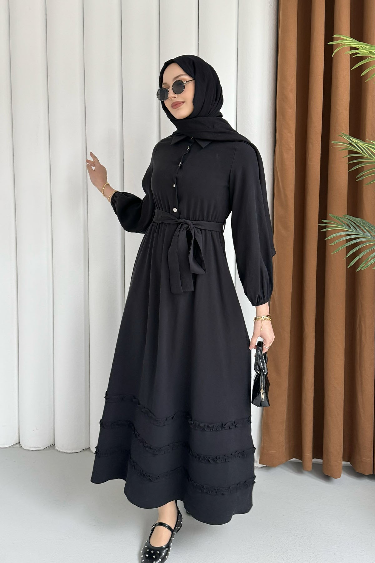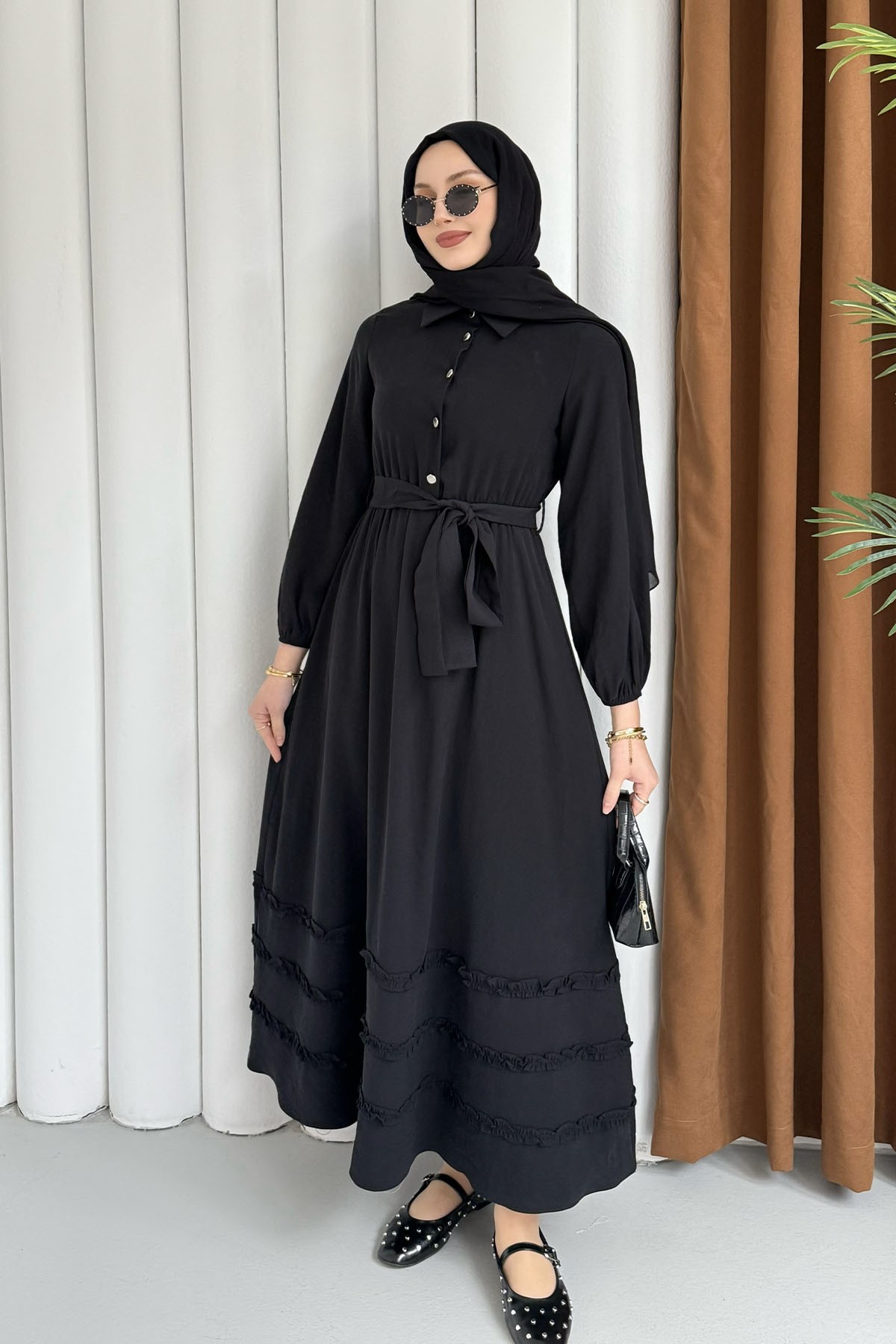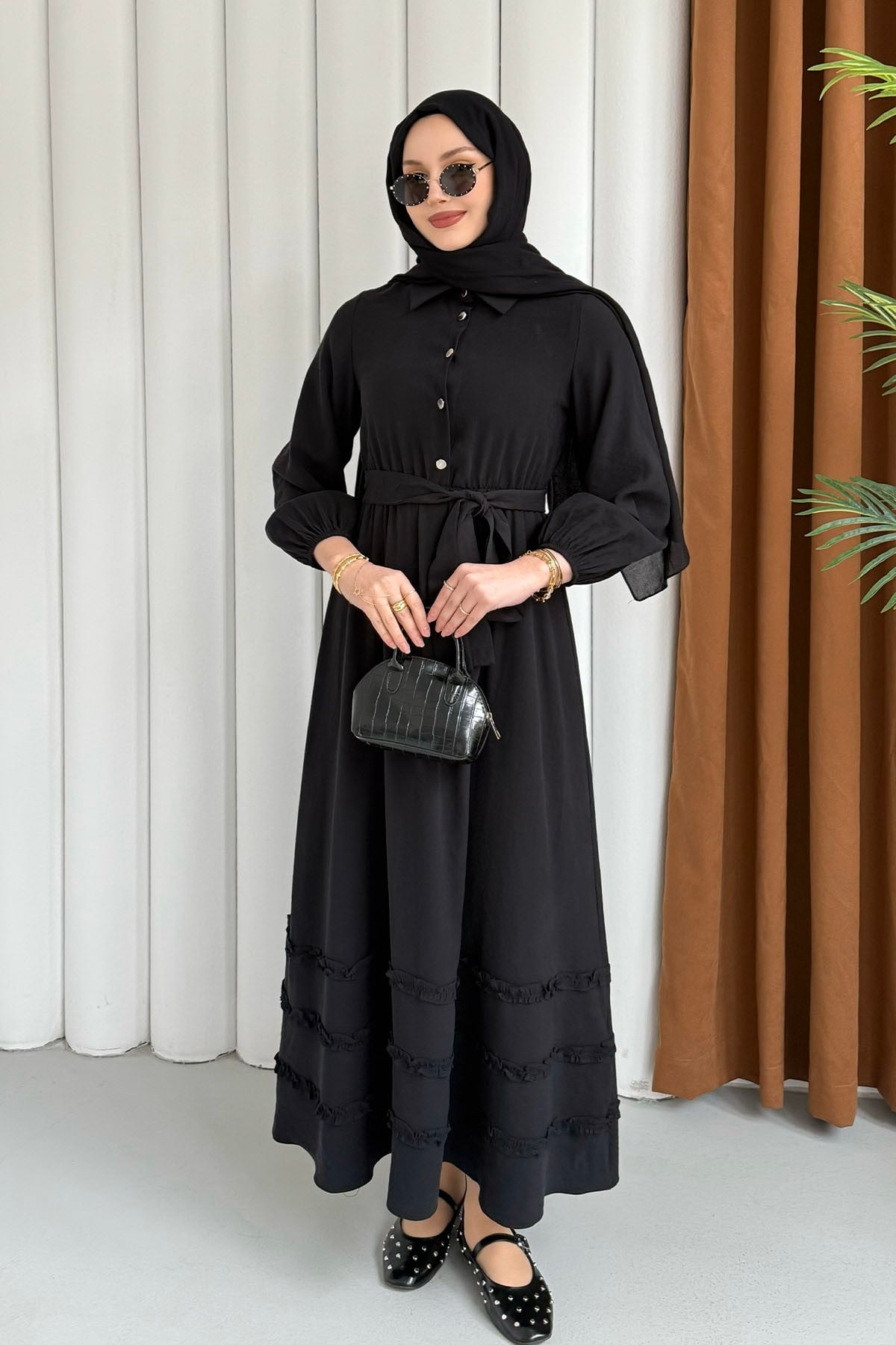 Twis Yarım Düğmeli Zarif Tesettür Elbise-SİYAH (5985)