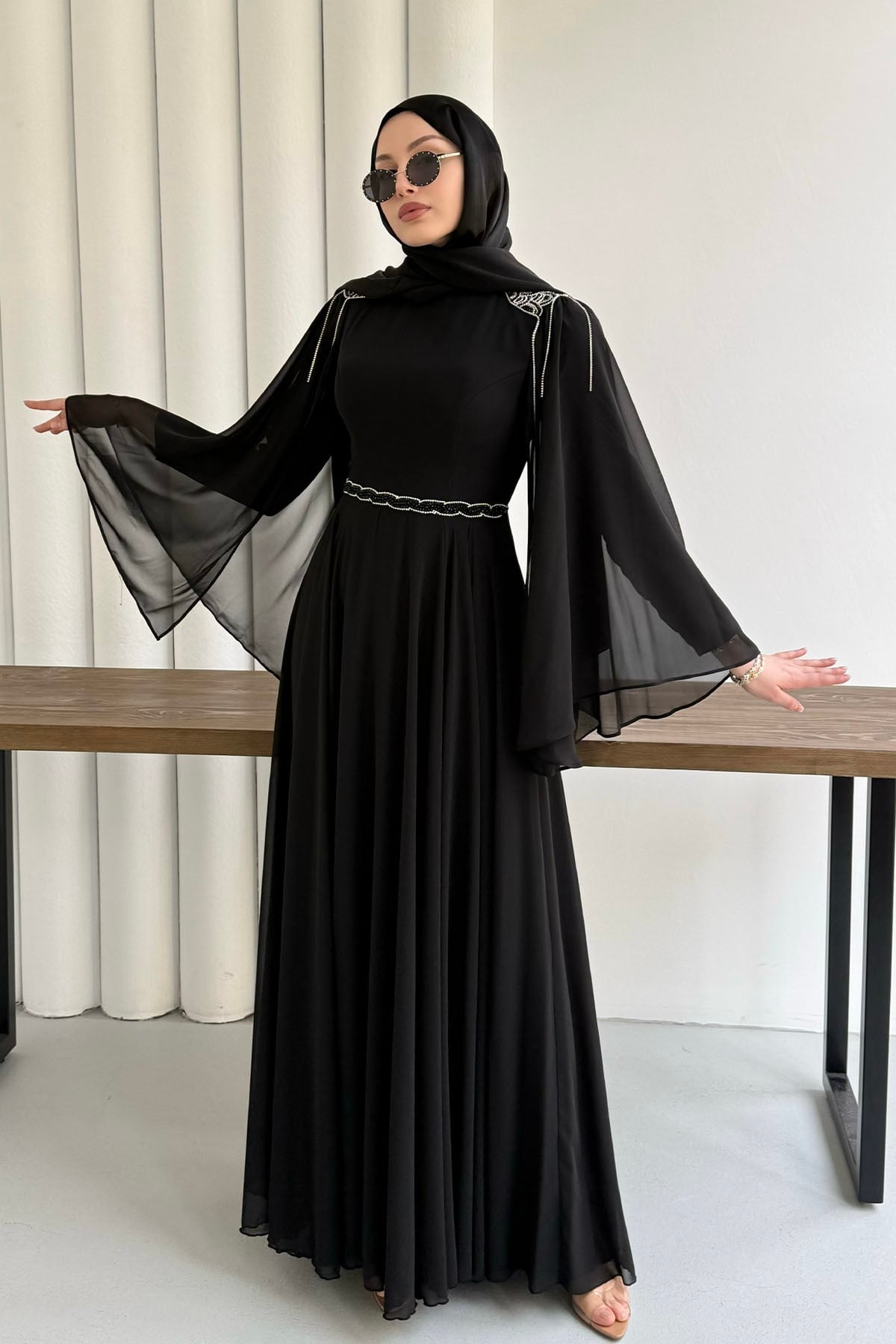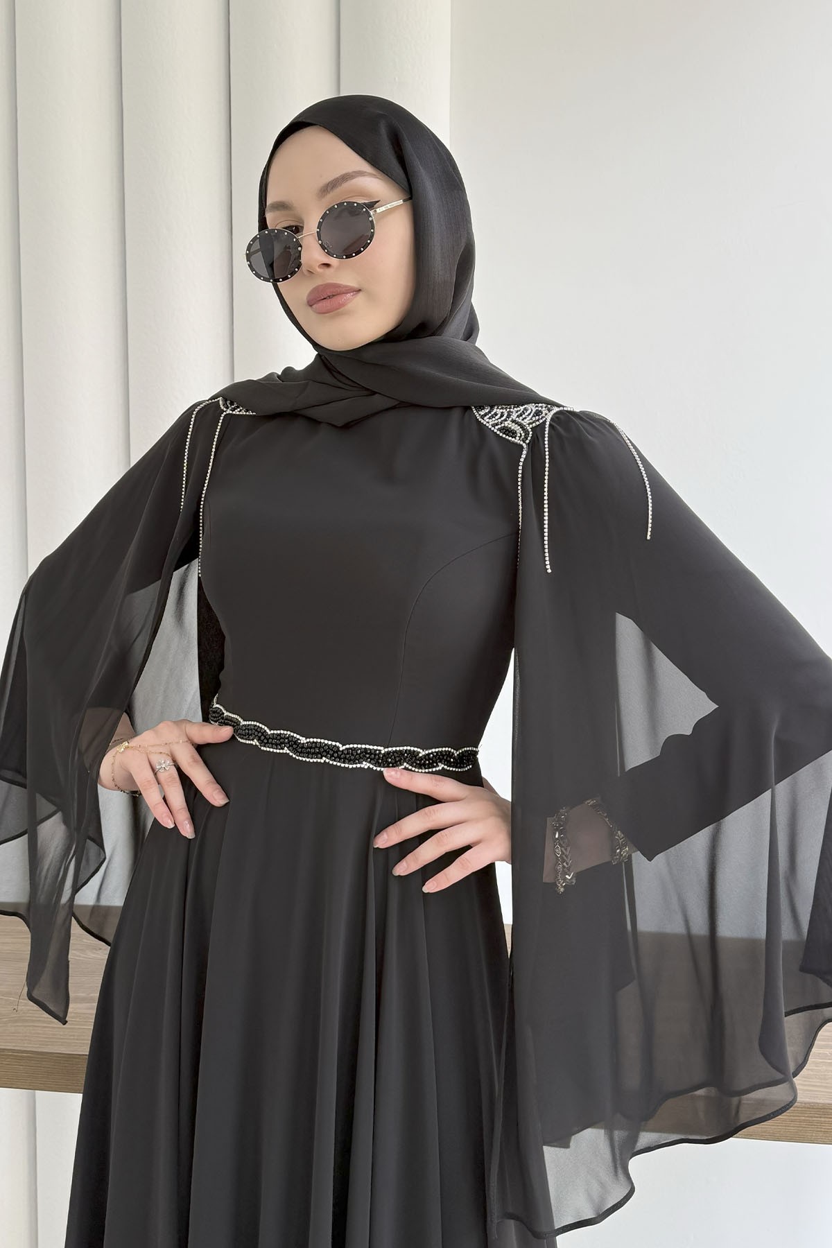 Ultra Lüks Taş İşlemeli Pelerin Kollu Tesettür Abiye-SİYAH (5209)