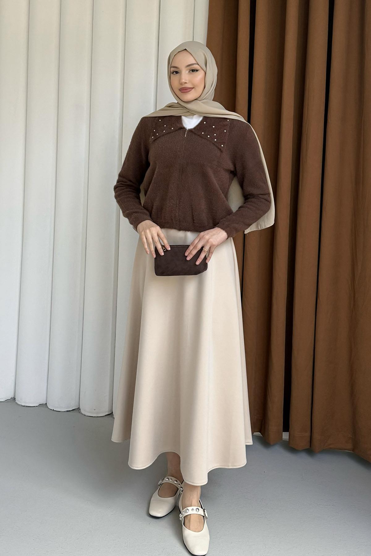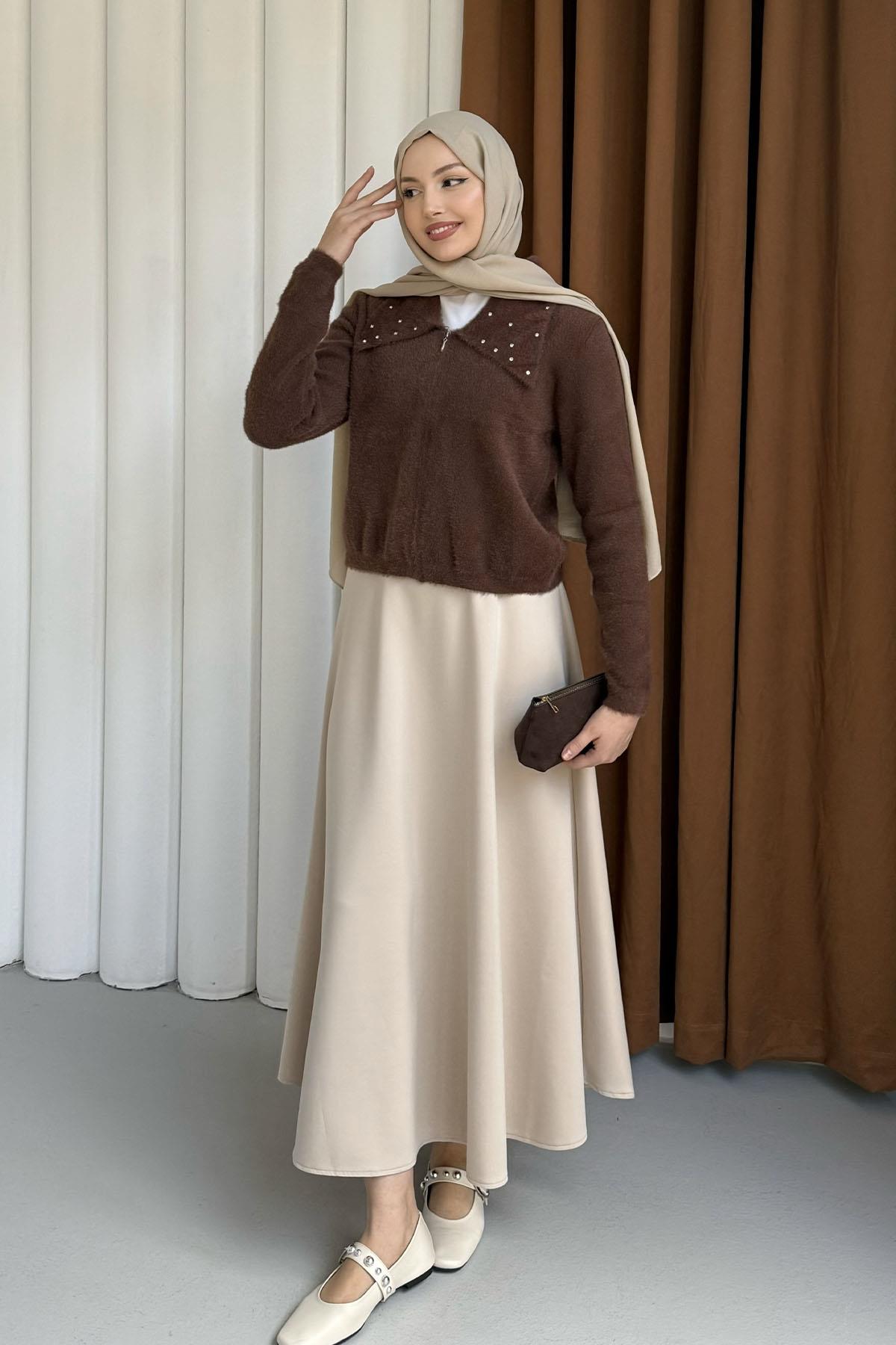 Yaka Taş Detaylı Fermuarlı Triko Hırka-KAHVERENGİ (006)