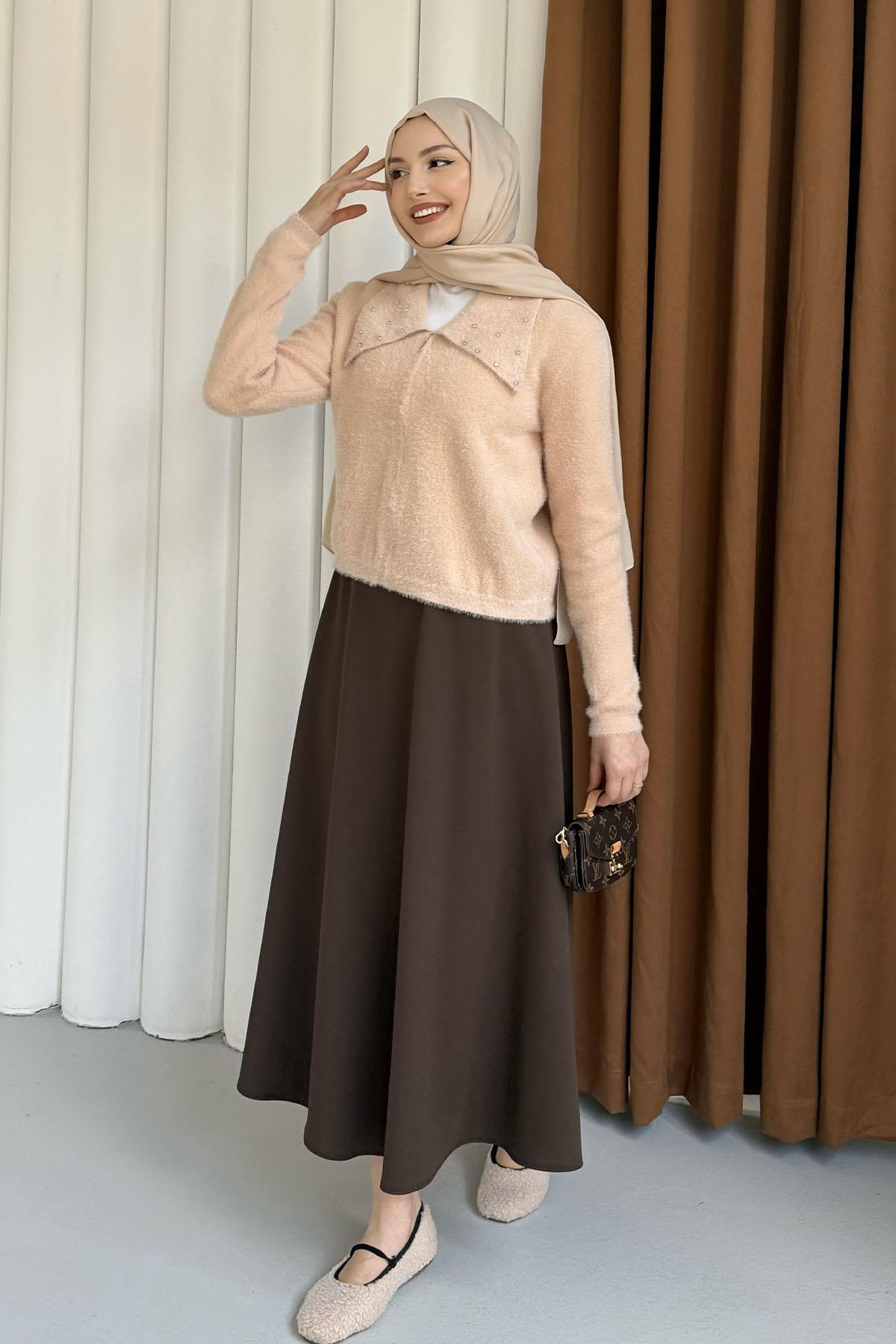 Yaka Taş Detaylı Fermuarlı Triko Hırka-PUDRA (006)