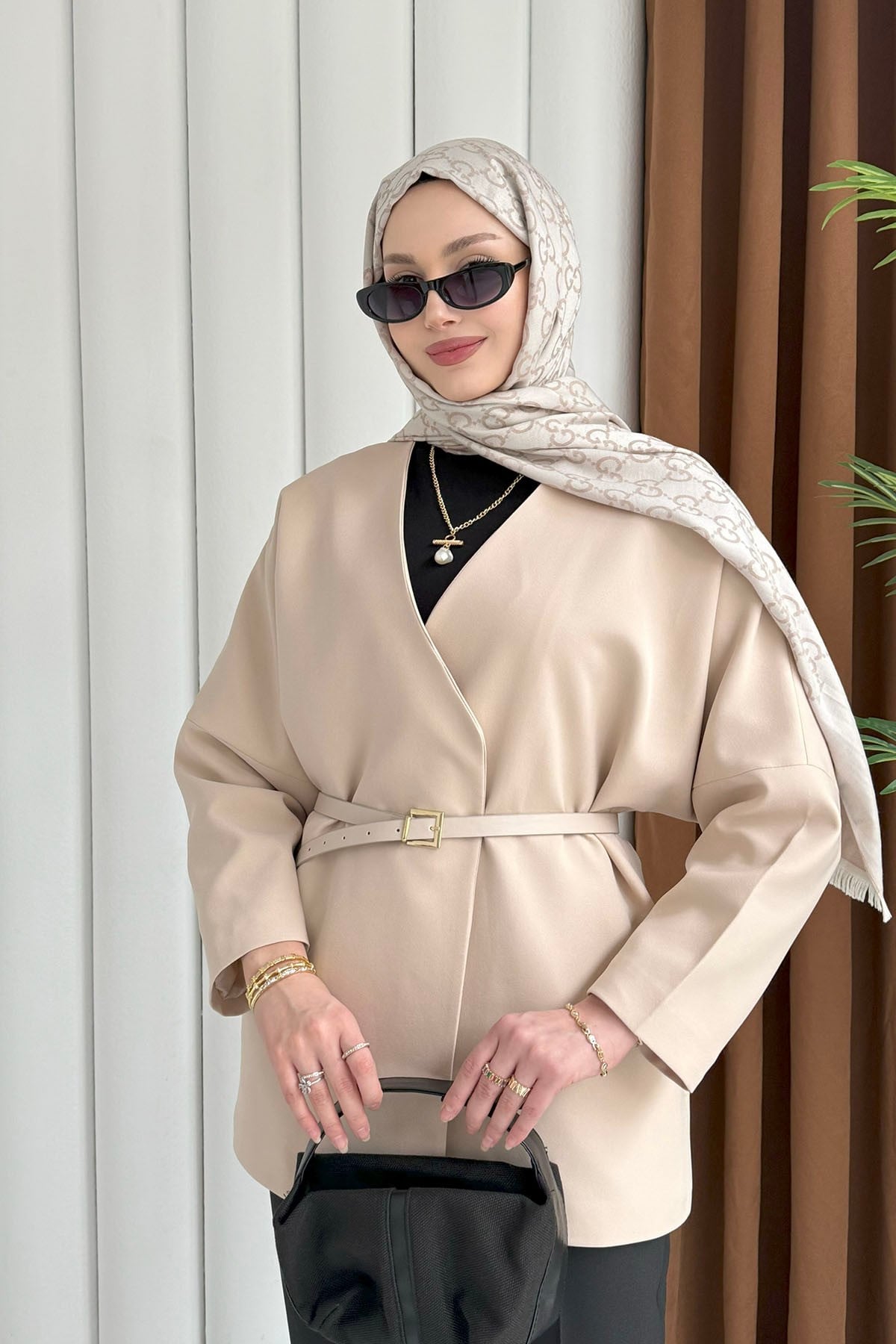 Yakasız Kemer Detaylı Ceket-TAŞ (1214)