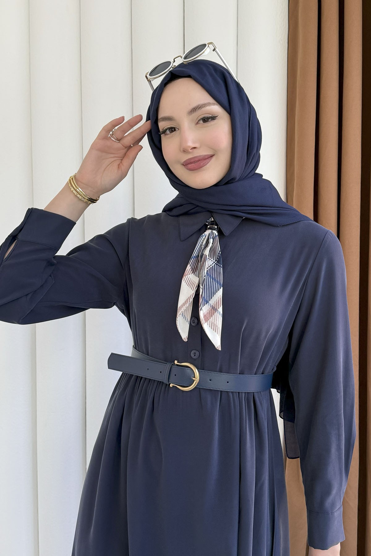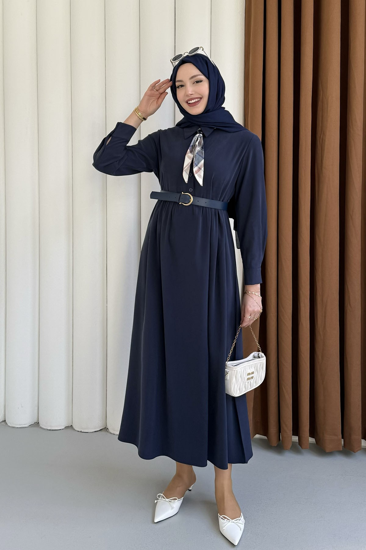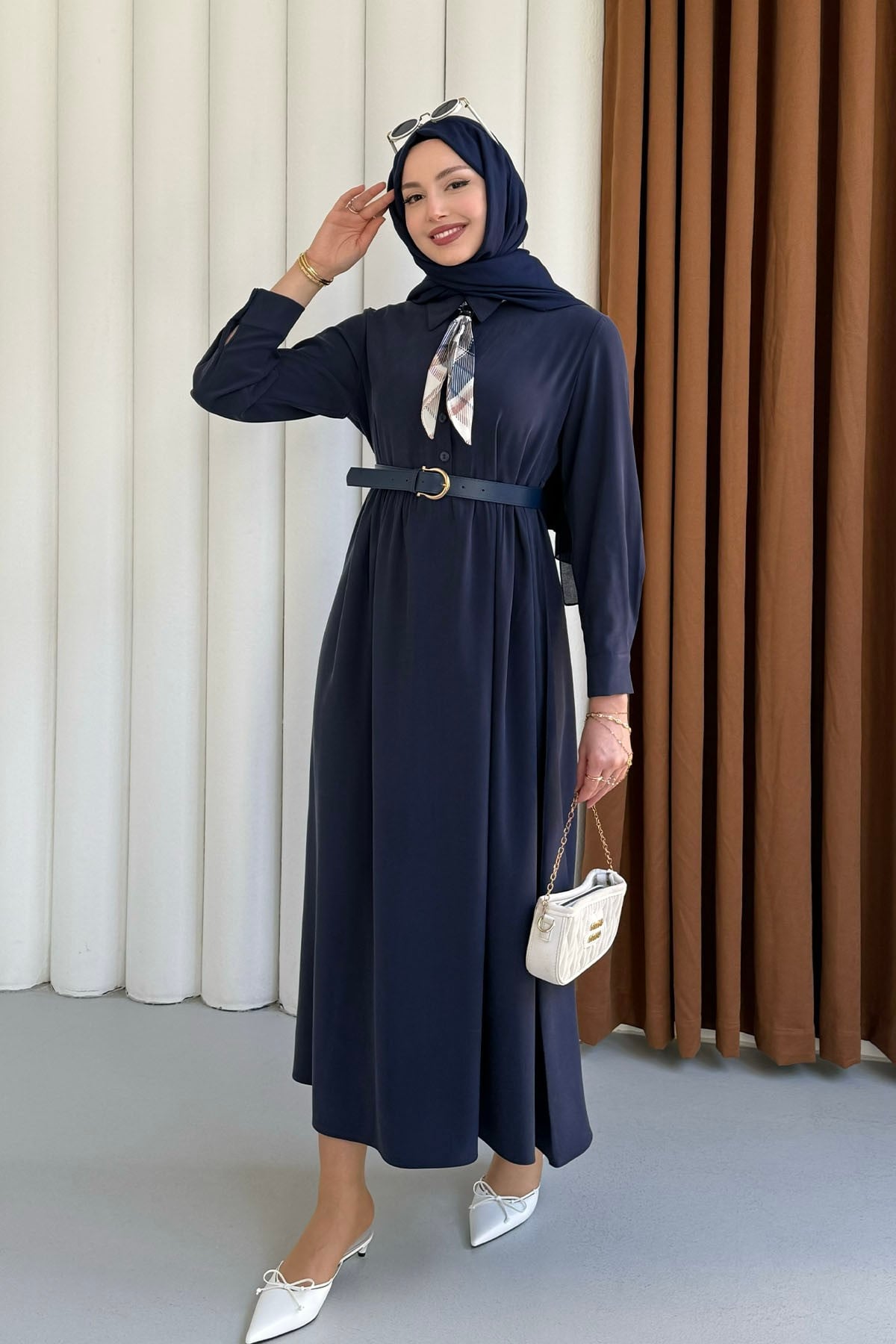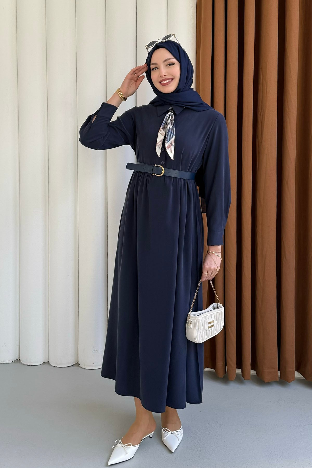 Yarım Düğmeli Fular Detaylı Kemerli Tesettür Elbise-LACİVERT (5990)