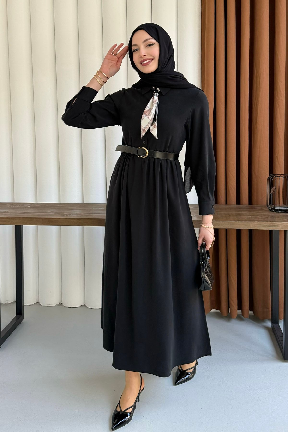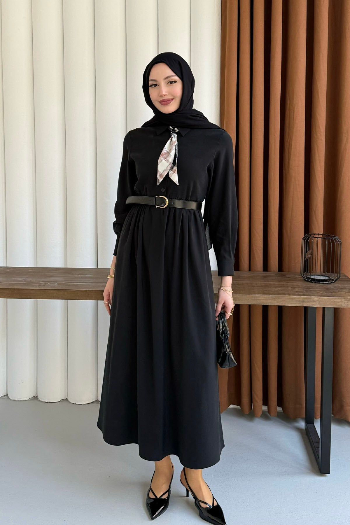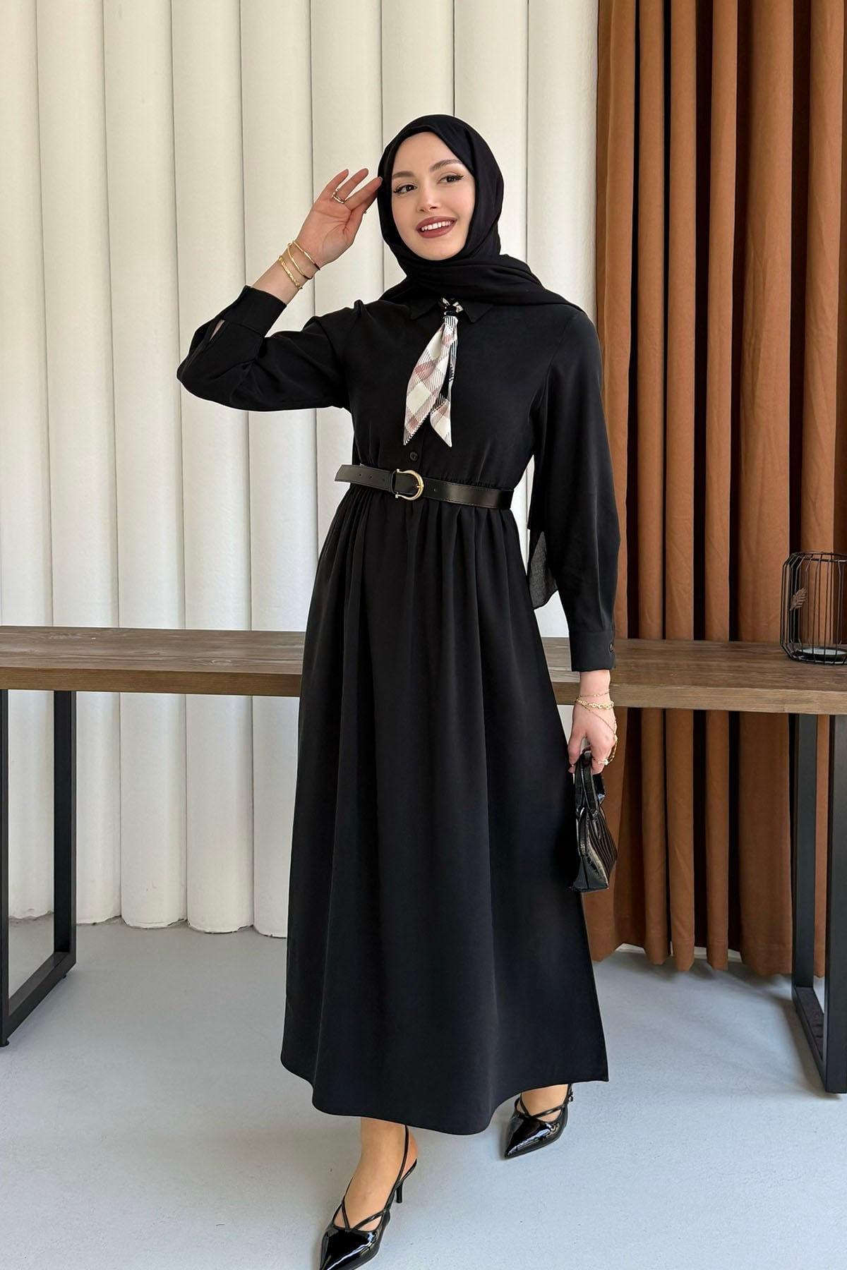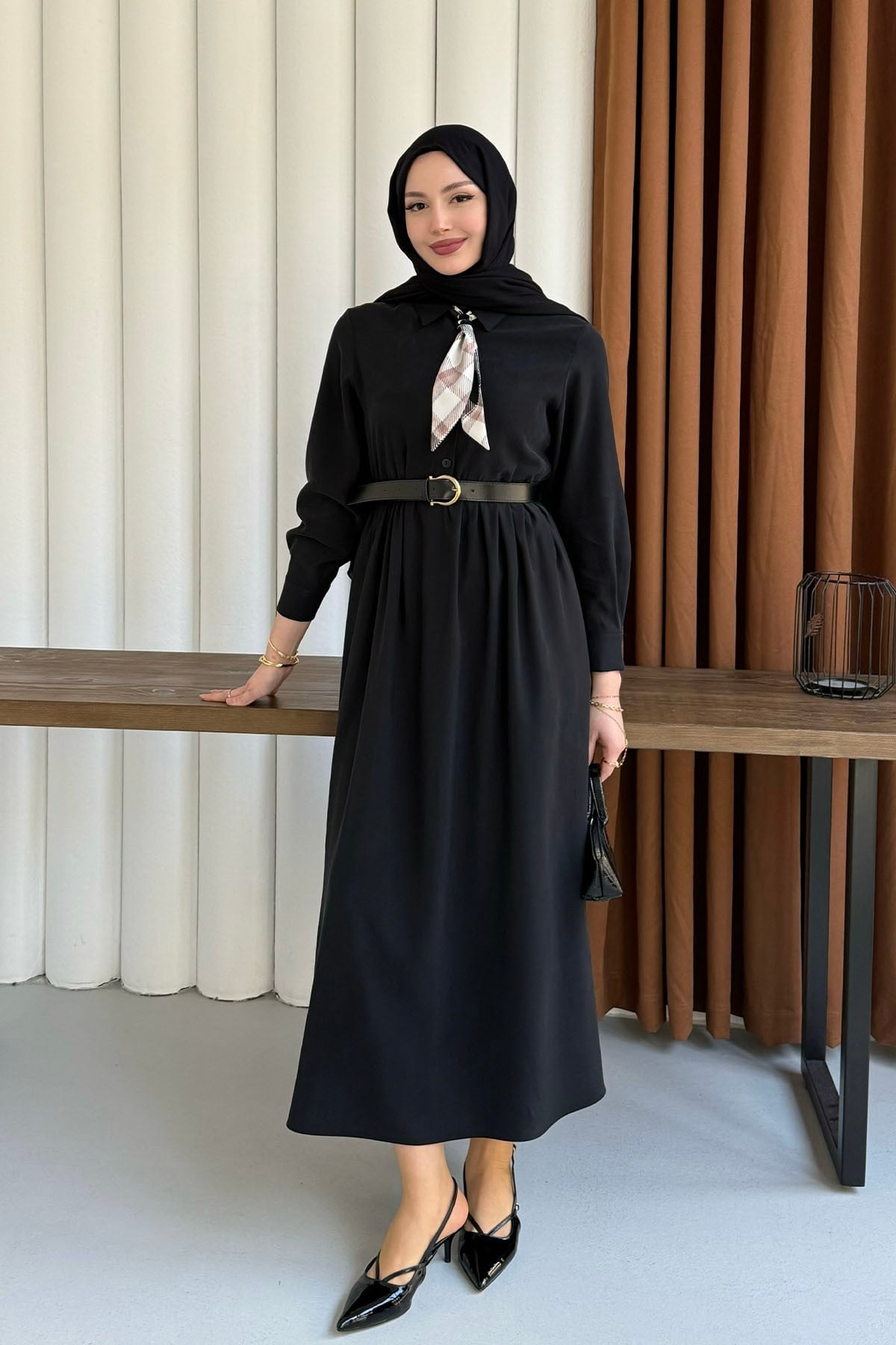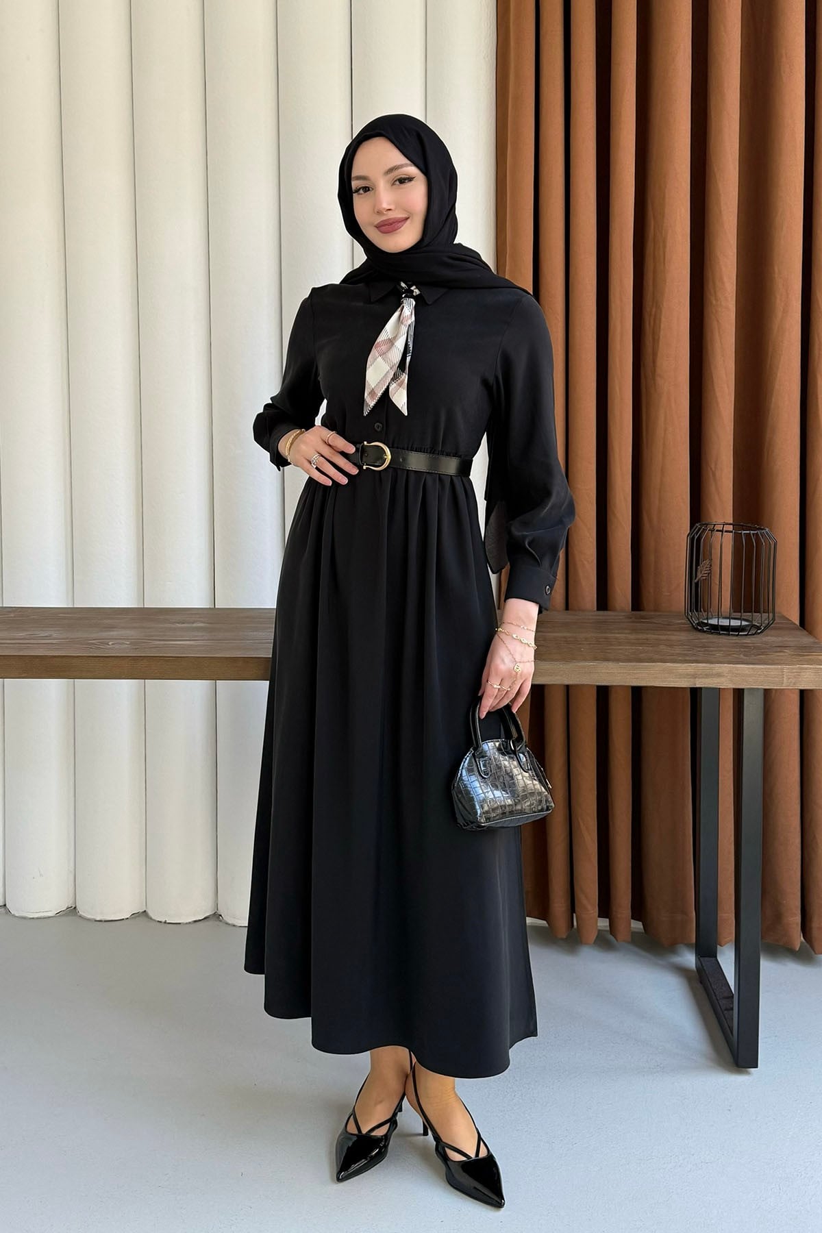 Yarım Düğmeli Fular Detaylı Kemerli Tesettür Elbise-SİYAH (5990)