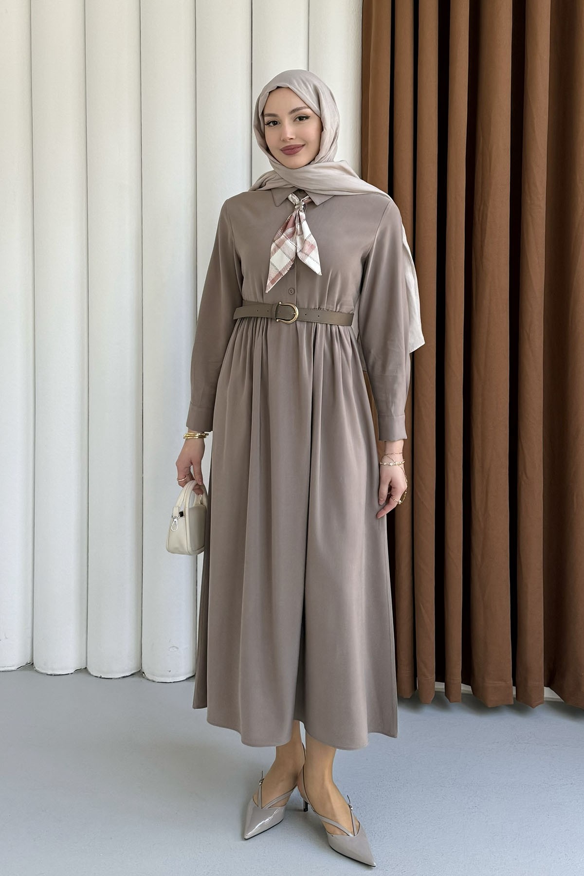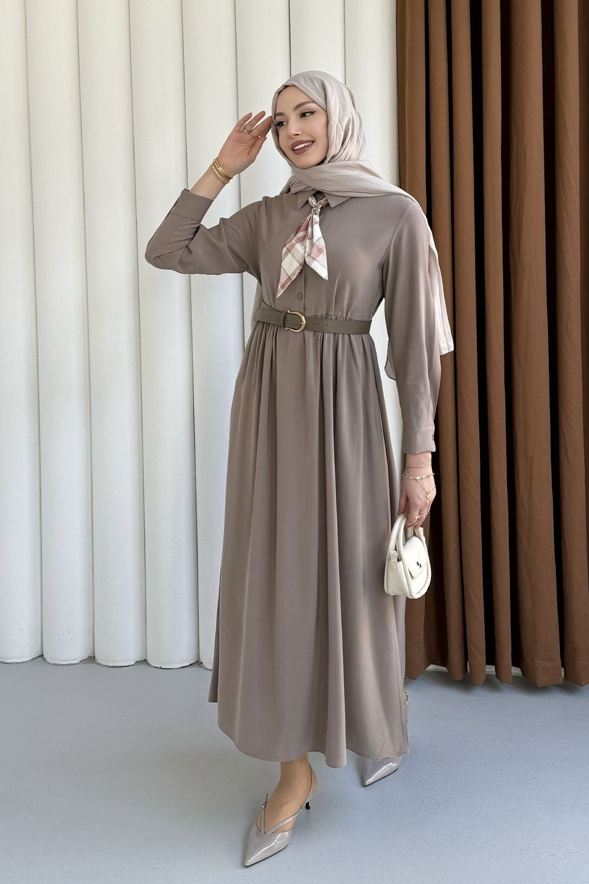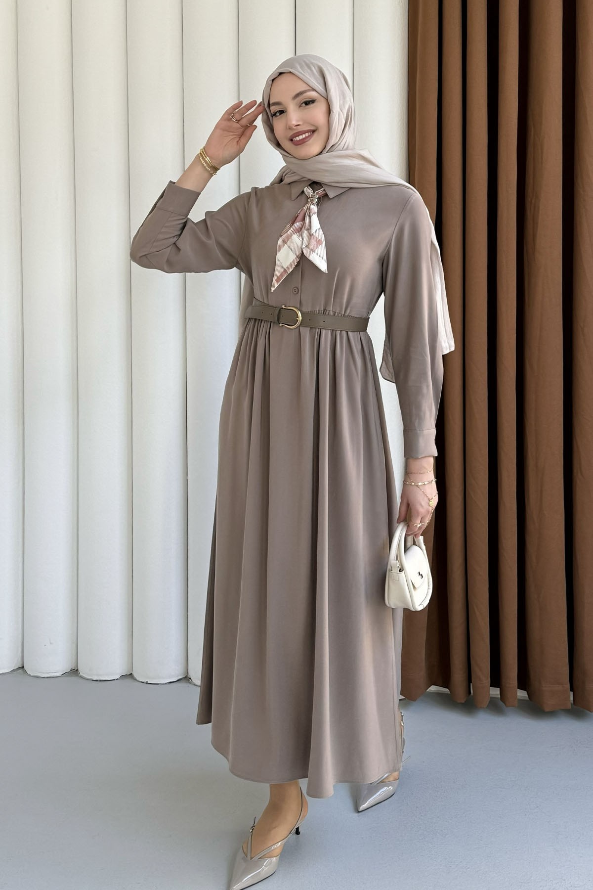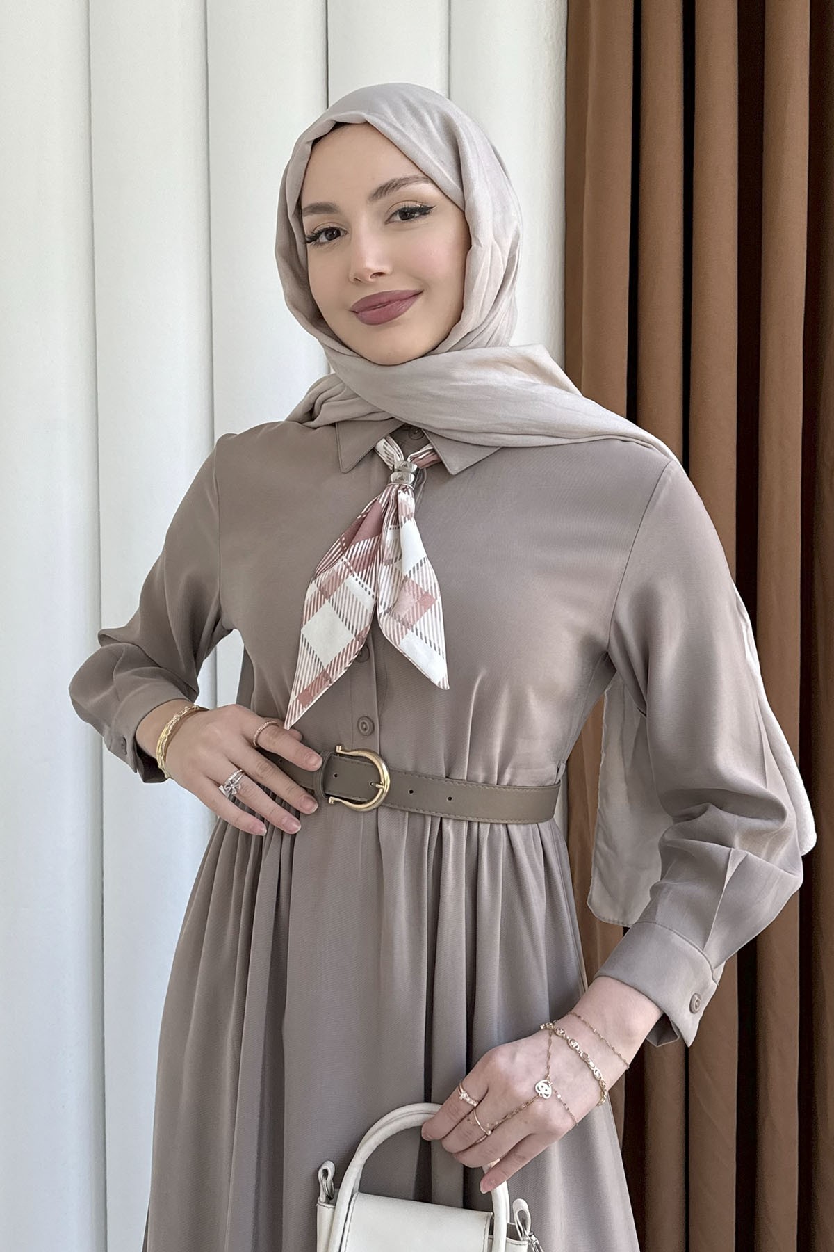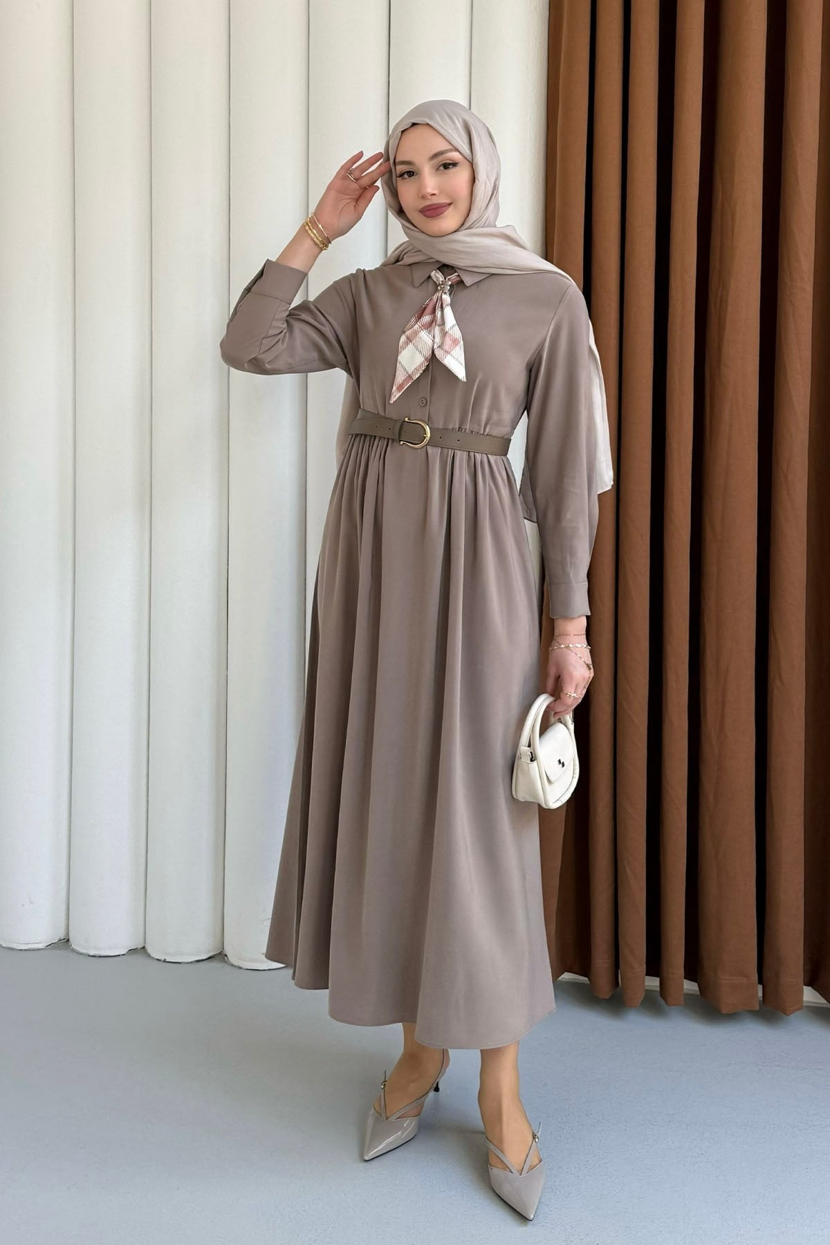 Yarım Düğmeli Fular Detaylı Kemerli Tesettür Elbise-VİZON (5990)